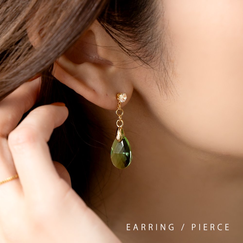 光を受けて煌めくドロップストーンのイヤリング/ピアス。ニュアンスある輝きがシンプルコーデのアクセントにぴったり◎耳元で揺らめくデザインでお顔周りを華やかに彩ります。低アレルギーのニッケルフリー素材を使用しているので、長時間の着用も安心です。