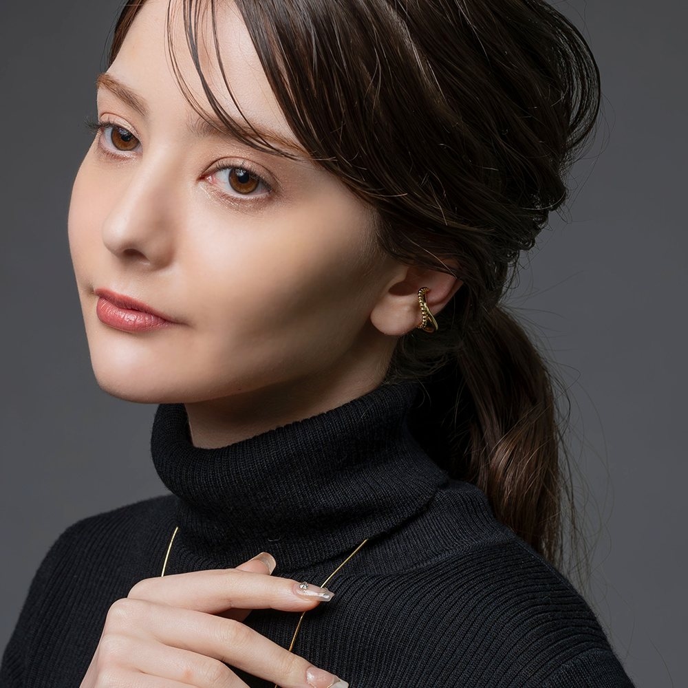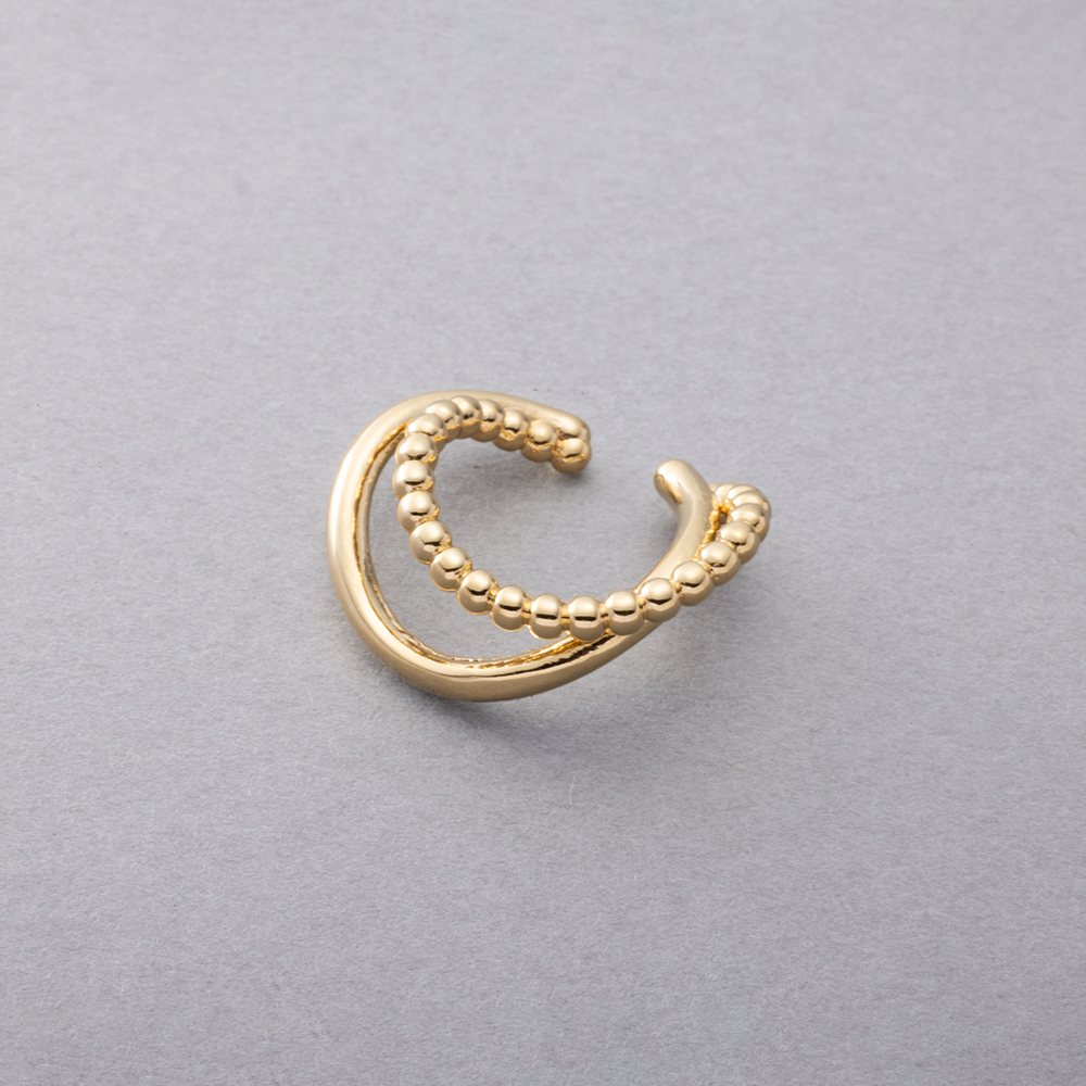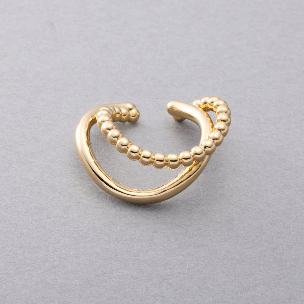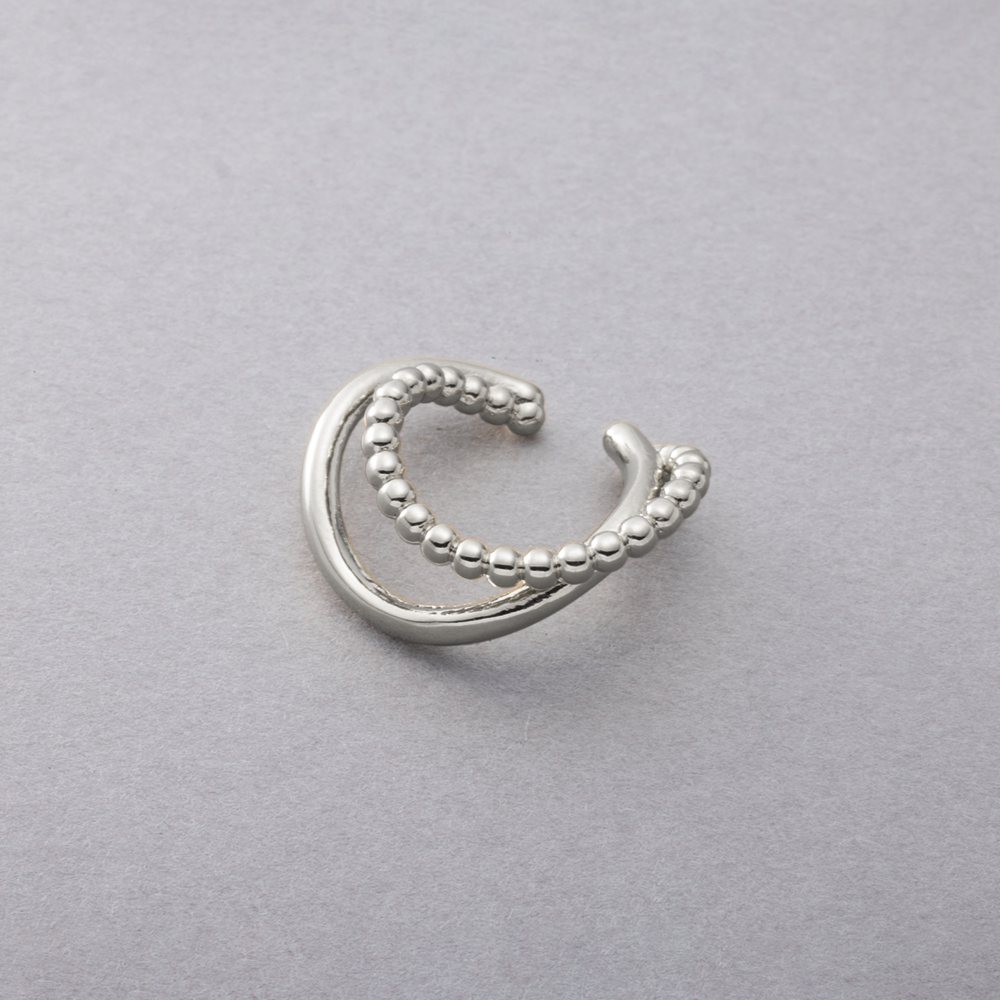 メタルボール×ウェーブラインの片耳用イヤーカフ。艶めきを放つダブルラインがさりげなく存在感を放つレイヤード風デザイン。一点投入するだけで周りと差がつくアイテムです。お手持ちのピアスと合わせても◎