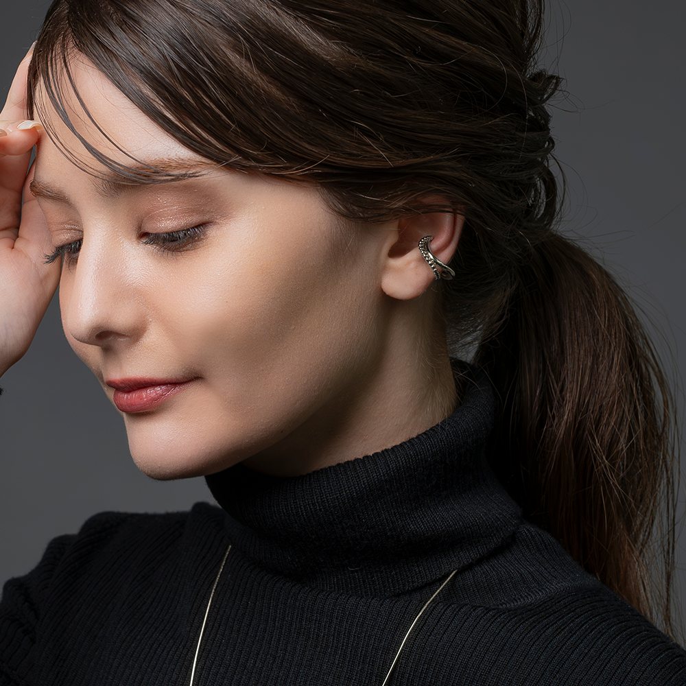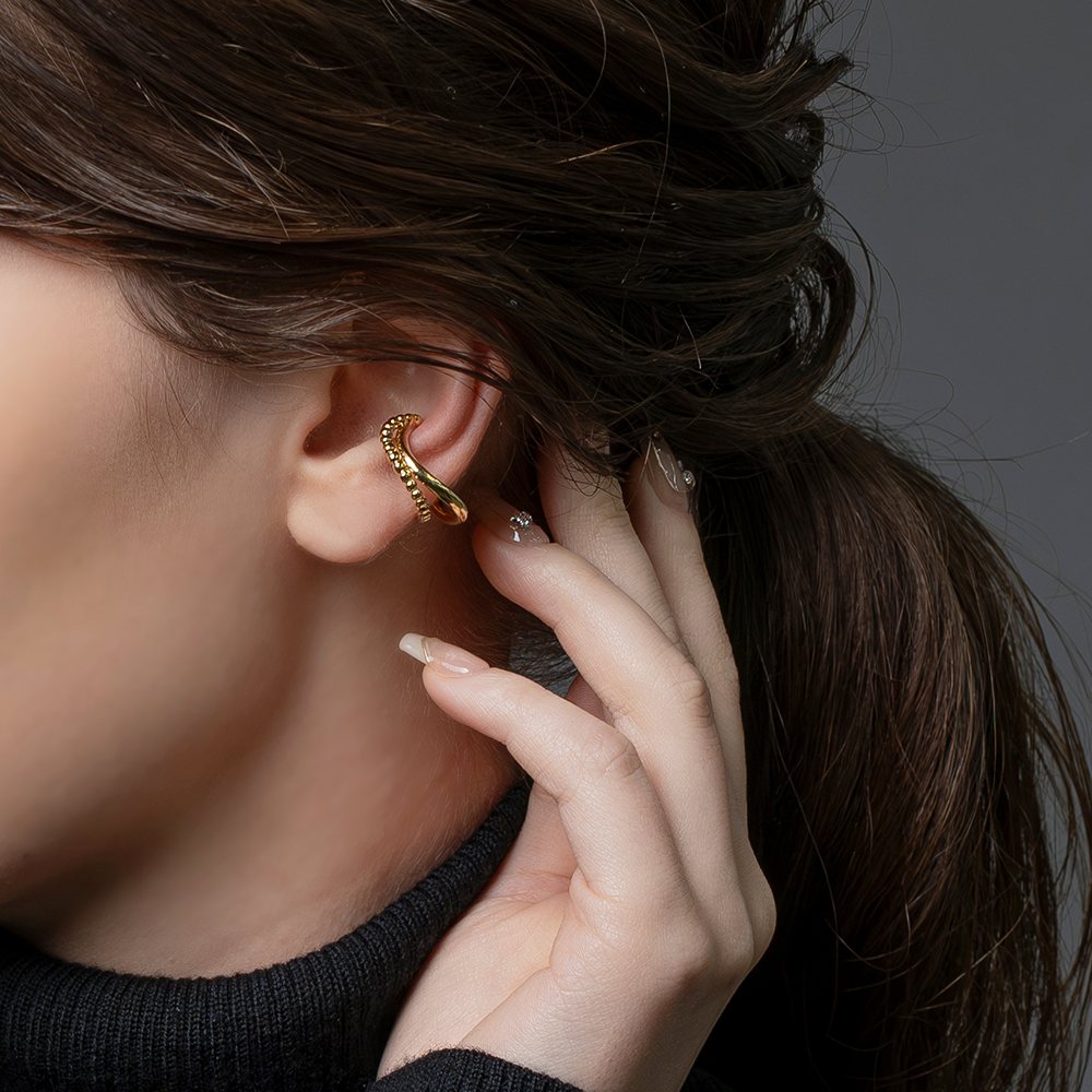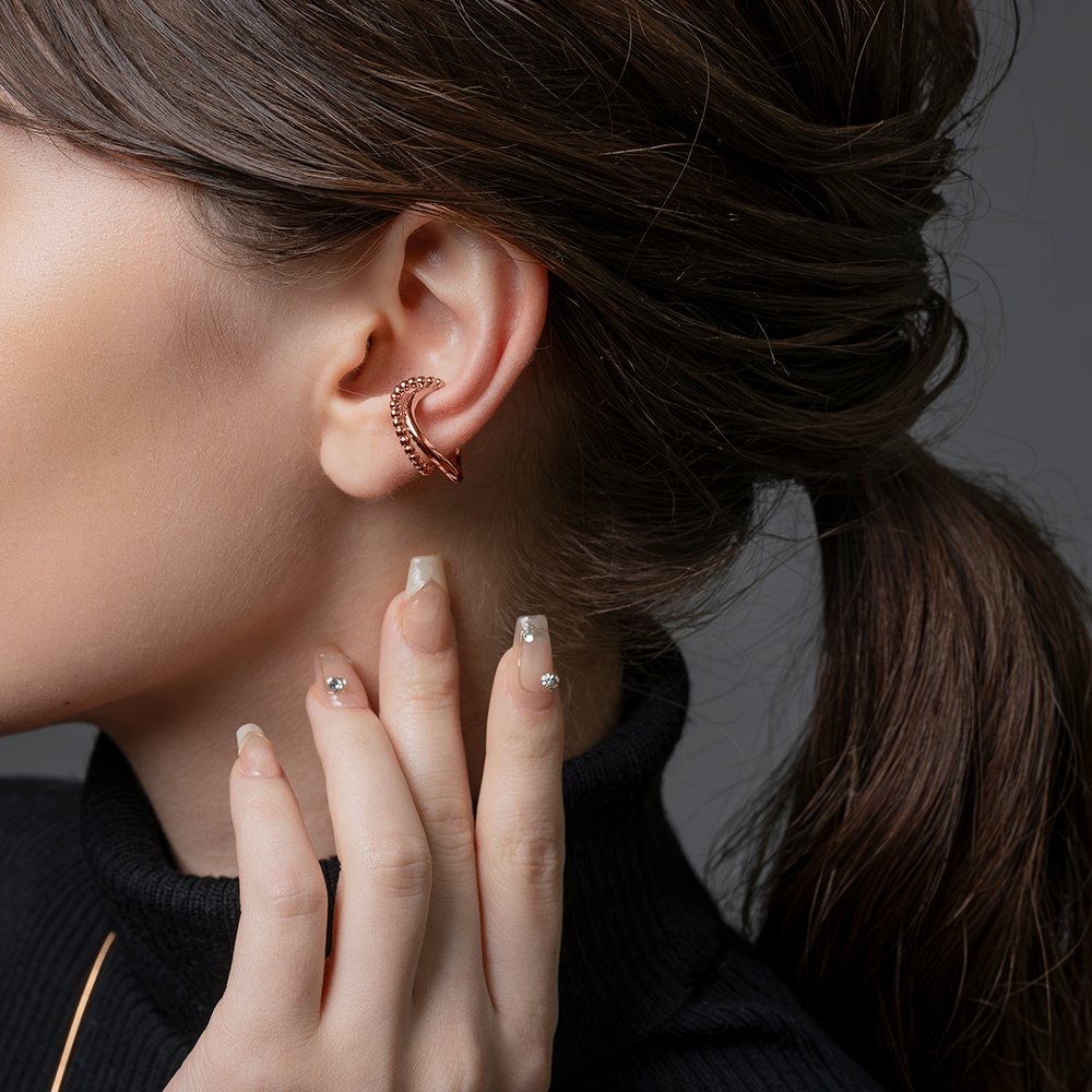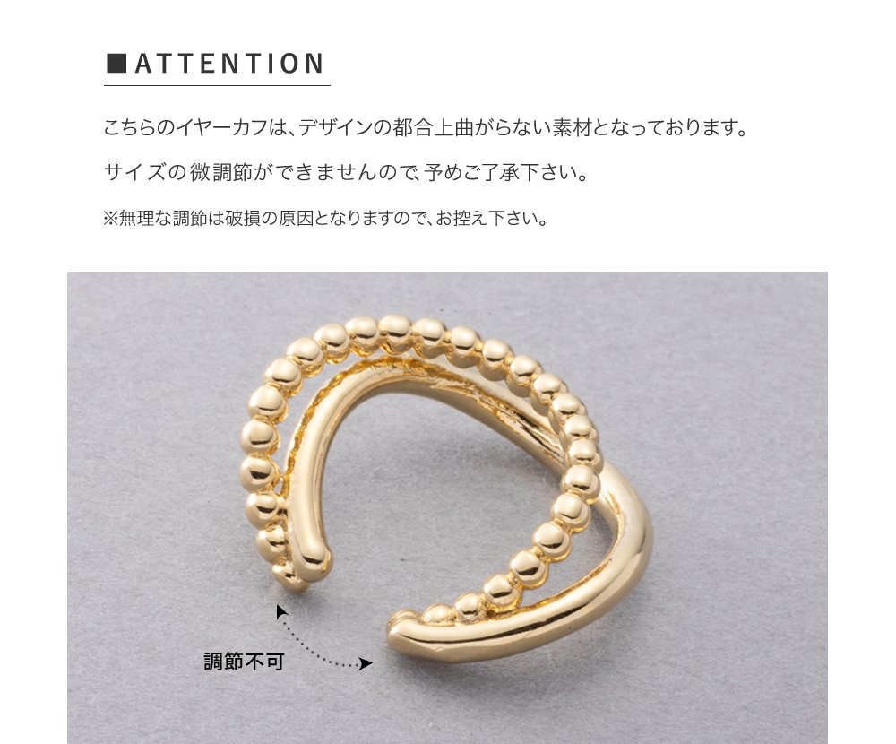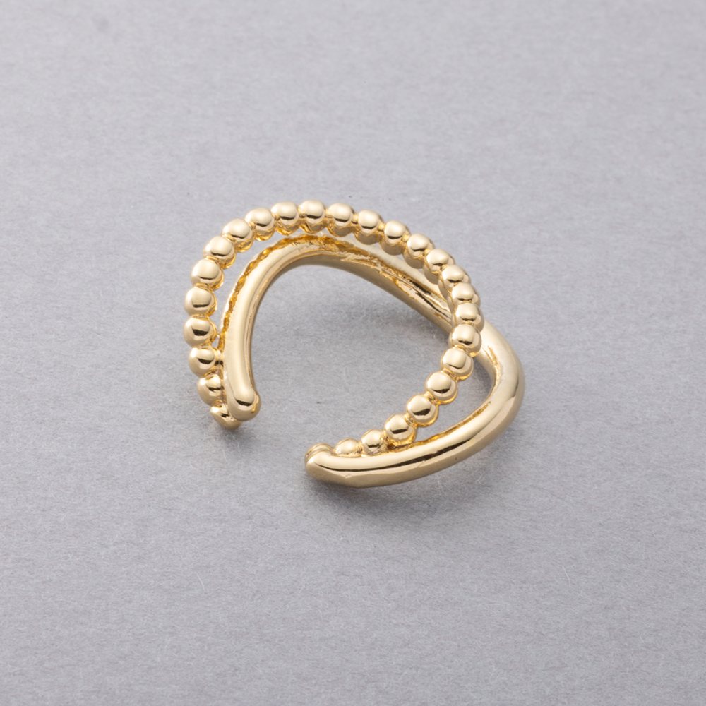 メタルボール×ウェーブラインの片耳用イヤーカフ。艶めきを放つダブルラインがさりげなく存在感を放つレイヤード風デザイン。一点投入するだけで周りと差がつくアイテムです。お手持ちのピアスと合わせても◎