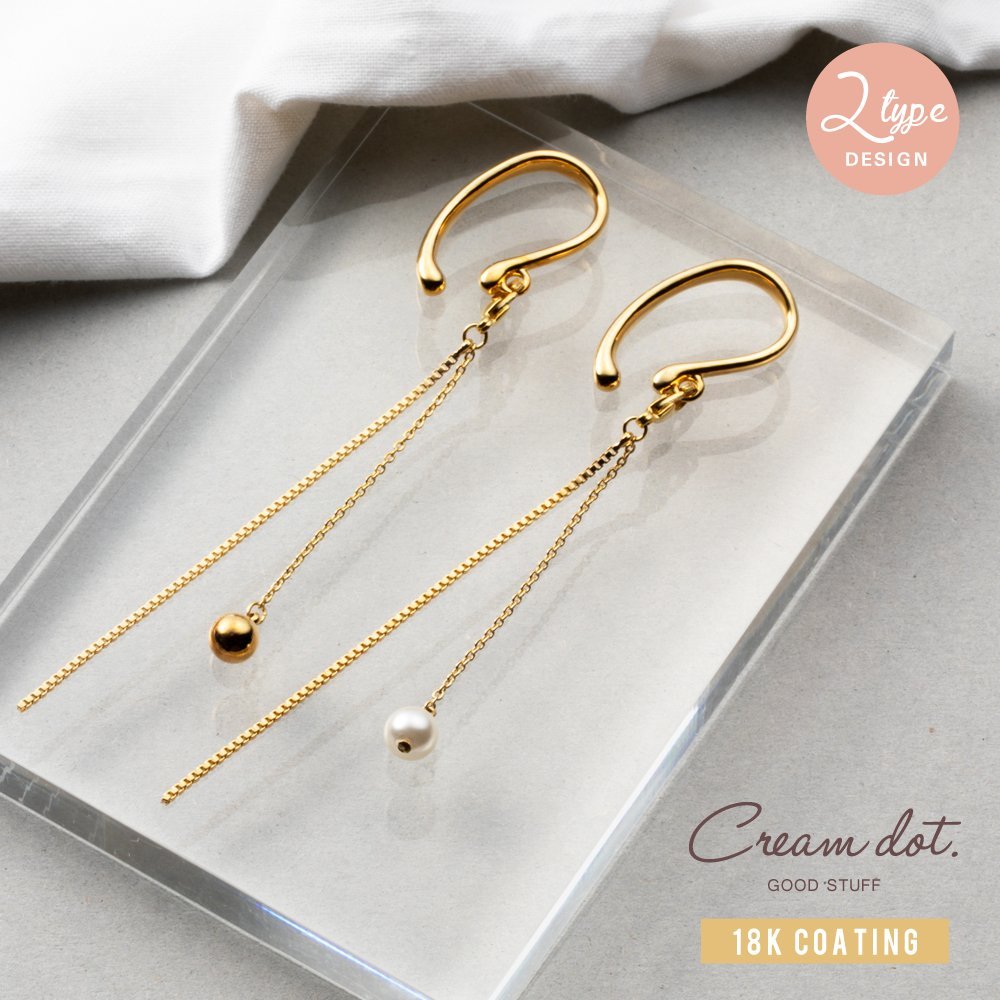 2種類チェーンと一粒パール/メタルボールを組み合わせた片耳用ロングイヤーカフ。