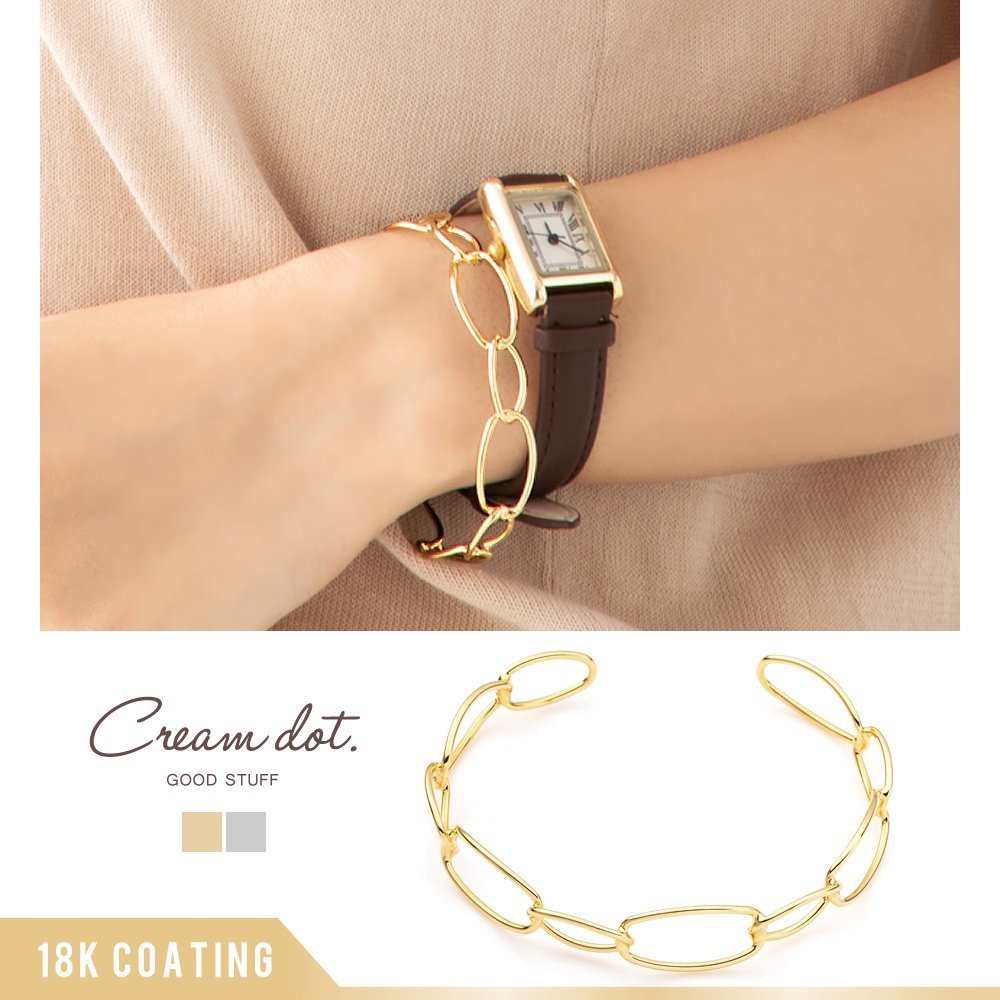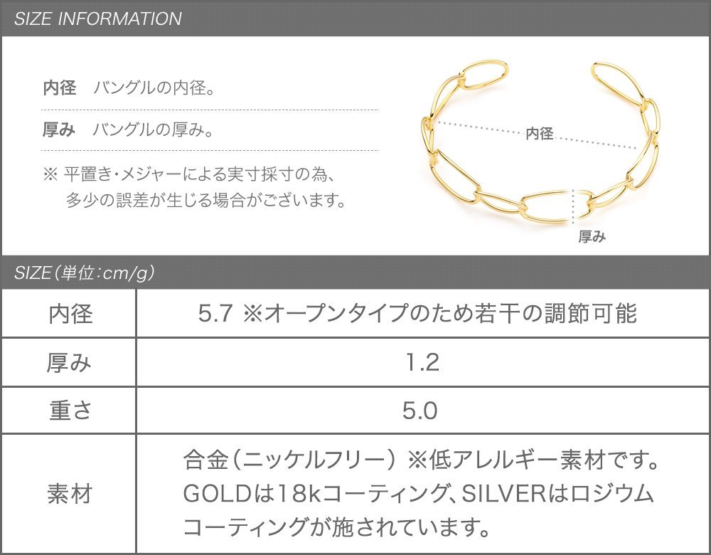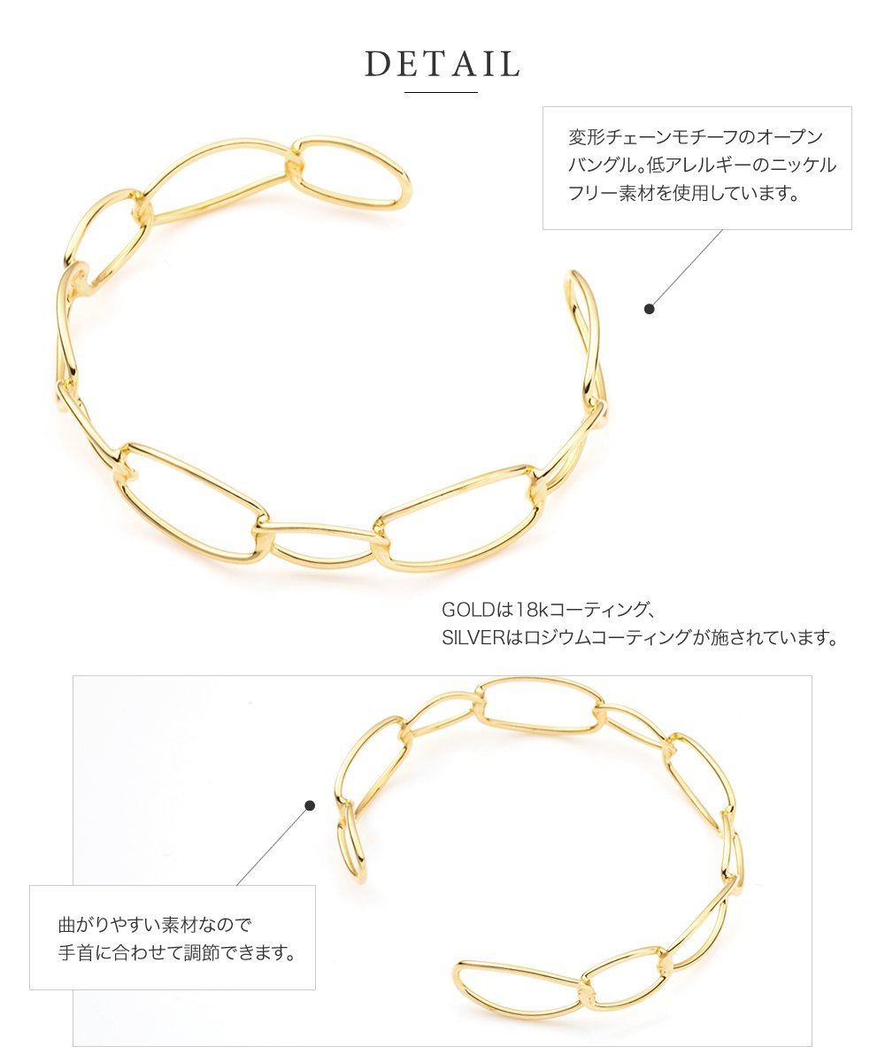 手元を大人っぽく演出してくれる変形チェーンモチーフのオープンバングル。