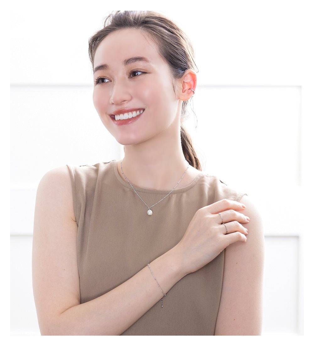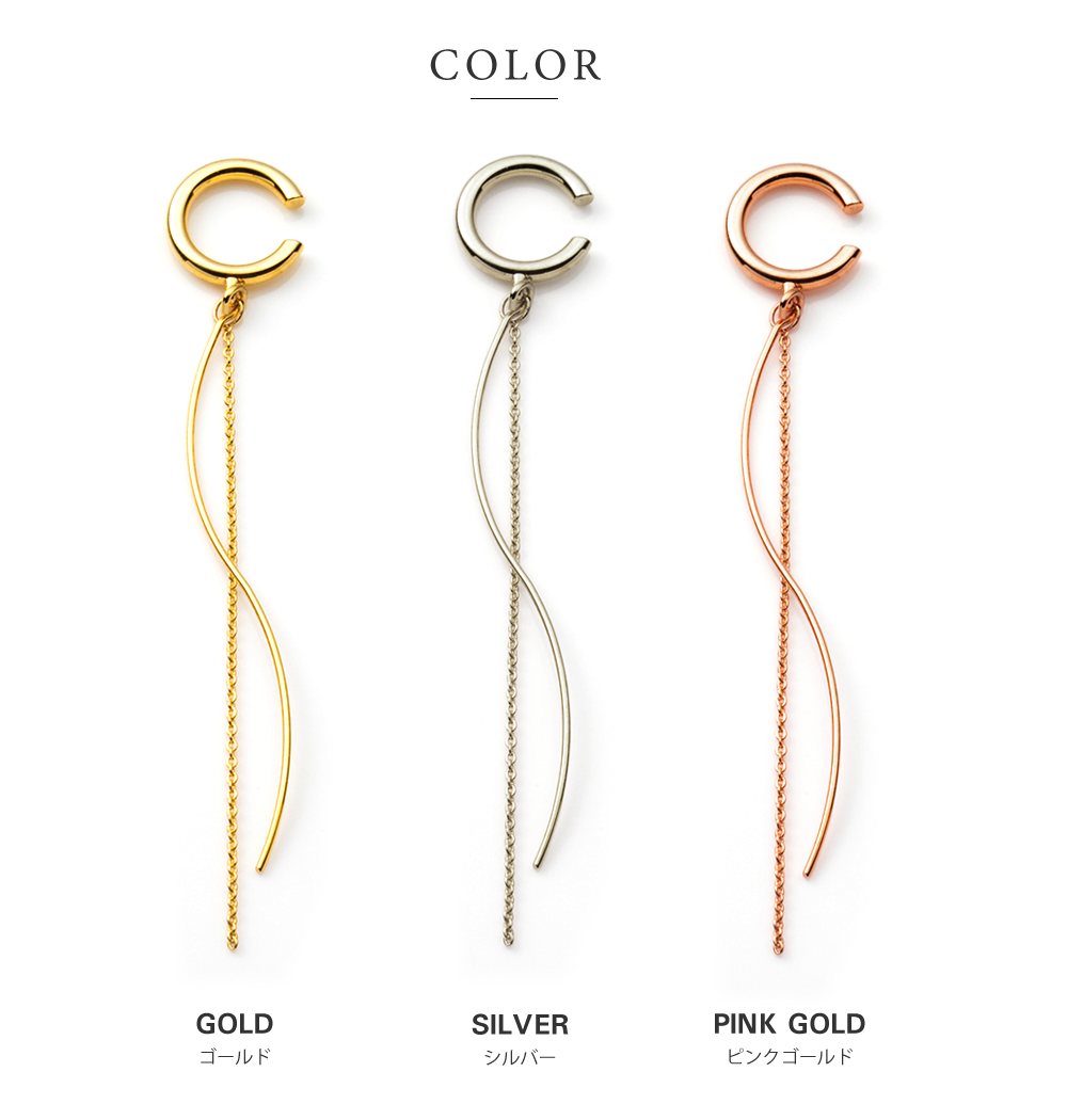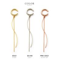 耳元で軽やかに揺れる、緩やかなメタルウェーブラインと華奢なロングチェーンの片耳用イヤーカフ。
