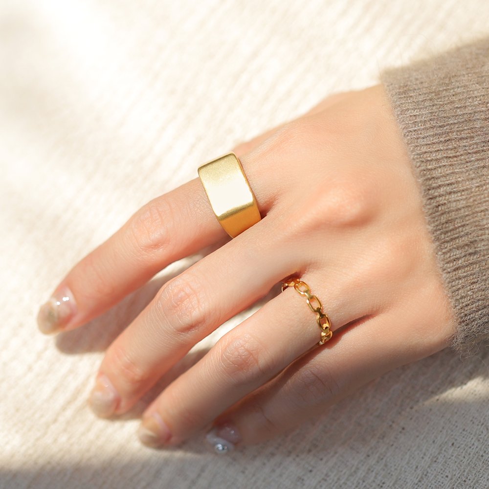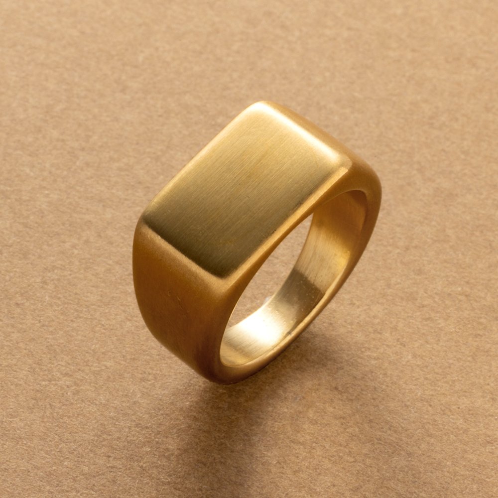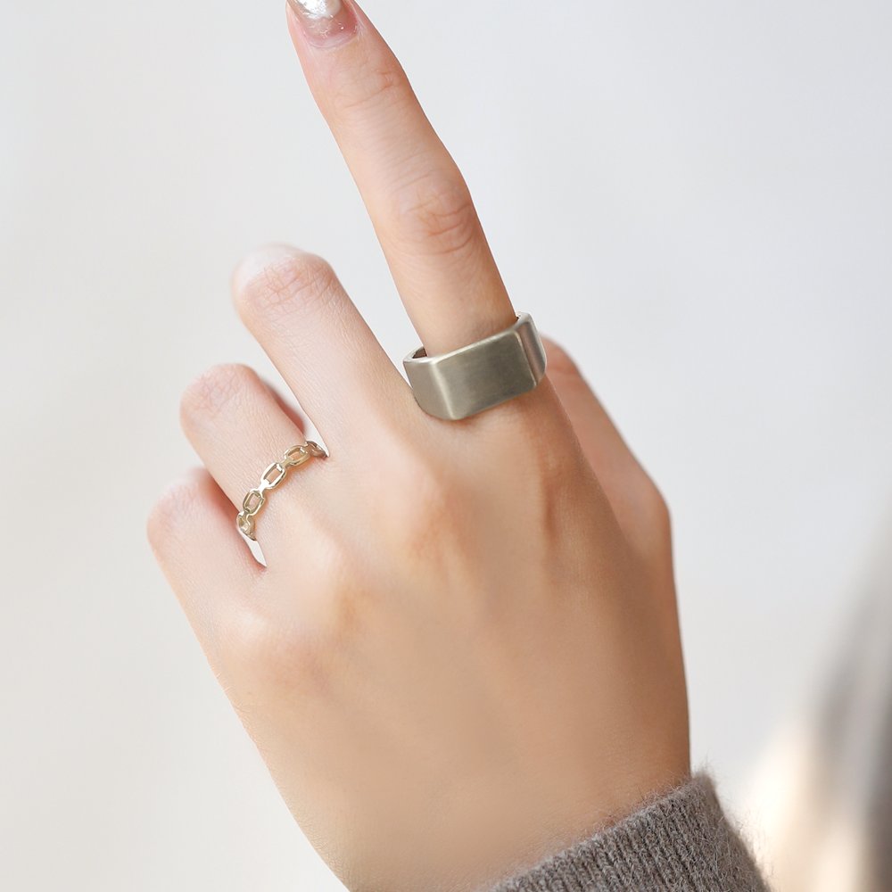 ヘアライン加工を施したセミマットな質感のリング。スクエアメタルと存在感のあるサイジングで大人っぽいニュアンスをプラスするひと品。シックなコーデにも相性抜群なアイテムです。