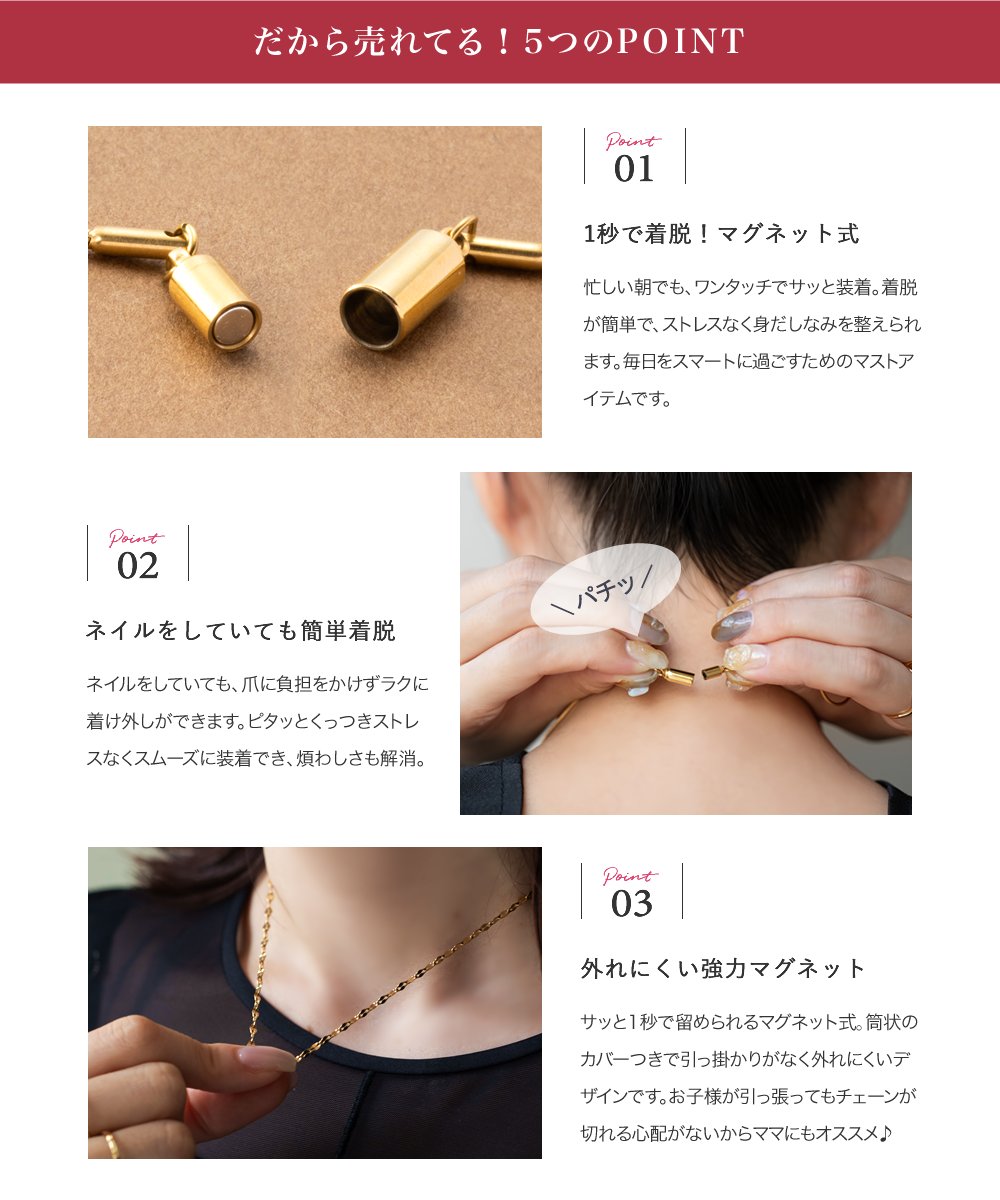 【本日限定!全品10%OFFクーポン】ネックレス サージカルステンレス 金属アレルギー マグネットクラスプ 簡単装着 つけっぱなし チェーン 4タイプ
