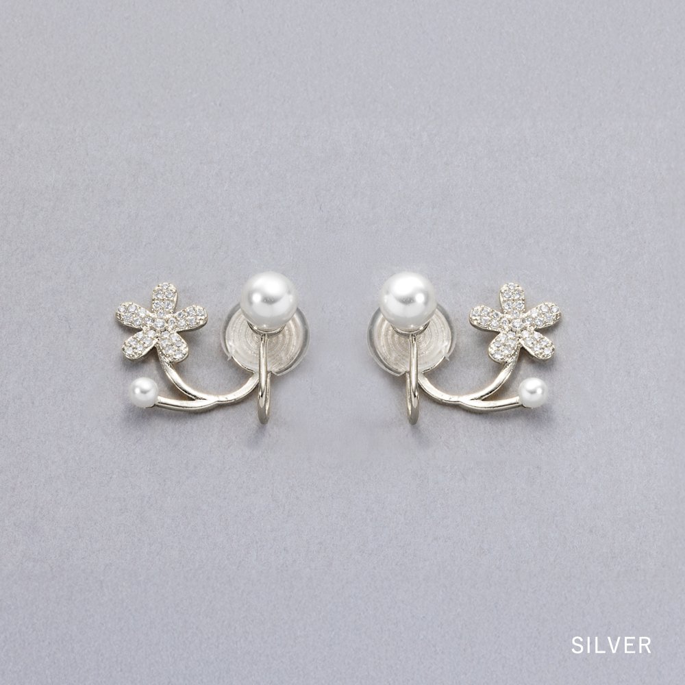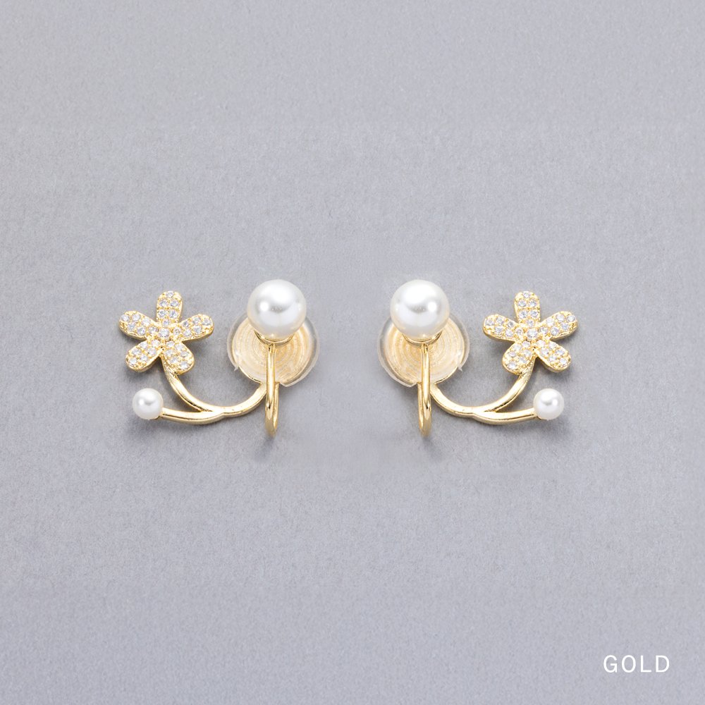 耳たぶに沿うパヴェフラワー×パールのレイヤード風ピアス/イヤリング。繊細な煌めきと、重ね着けしたようなデザインが大人可愛いアイテム。普段使いはもちろん、結婚式・お呼ばれ・パーティーシーンなどで幅広く活躍しそう。