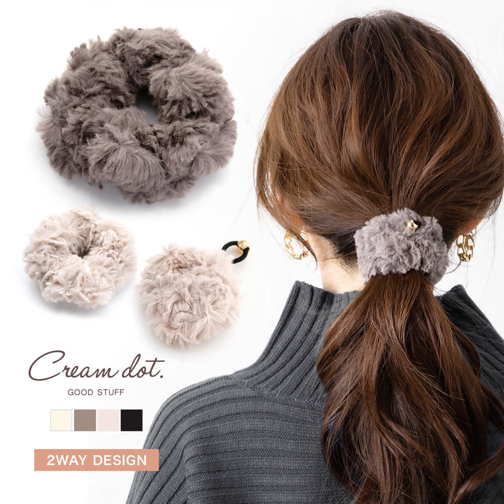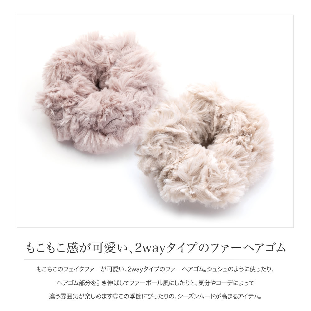 もこもこのフェイクファーが可愛い、2wayタイプのファーヘアゴム。シュシュのように使ったり、ヘアゴム部分を引き伸ばしてファーボール風にしたりと、気分やコーデによって違う雰囲気が楽しめます◎この季節にぴったりの、シーズンムードが高まるアイテム。