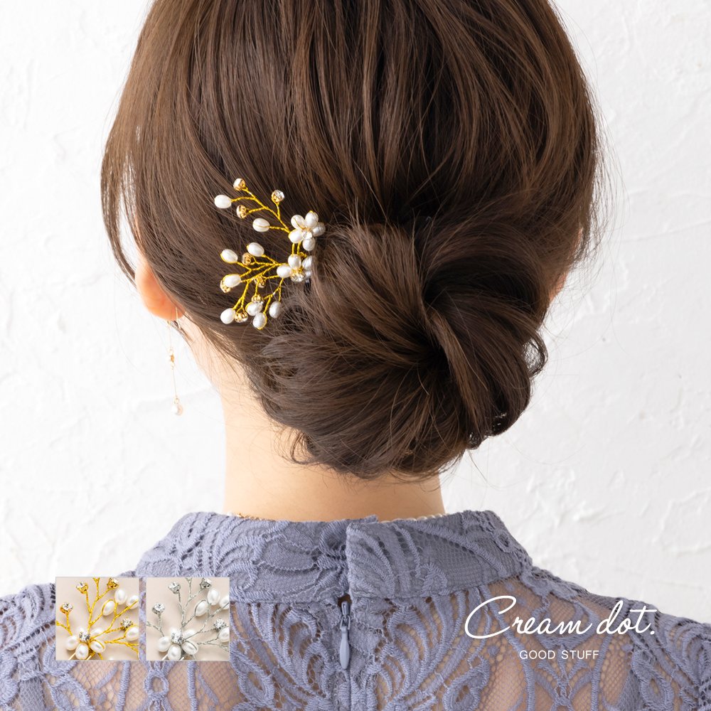 華奢ワイヤーにパールとビジューを飾ったデコラティブなコーム。フラワーを模したパールモチーフは華やかすぎず、品よく清楚な印象に仕上げてくれます。アレンジにプラスしやすく、お呼ばれシーンにぴったり◎
