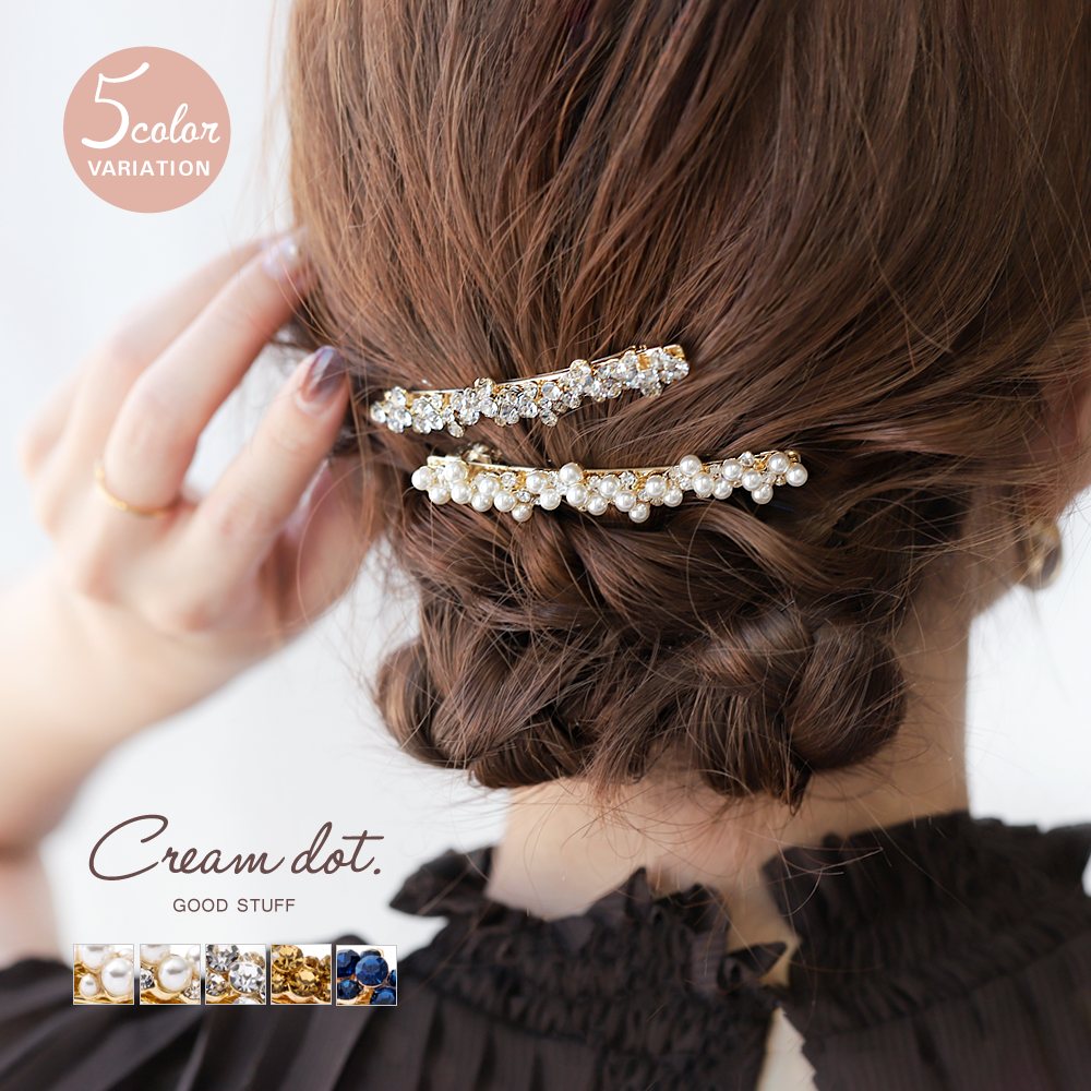 パールやビジューが光を受けて煌めき、パッと明るい雰囲気に導いてくれるバレッタ。程よいサイズ感で派手になりすぎず、うしろ姿に品のある華やぎをプラスします。