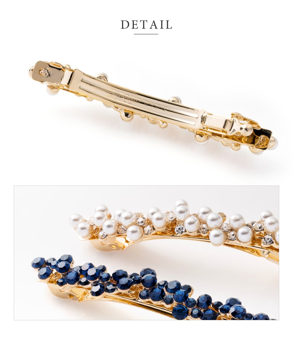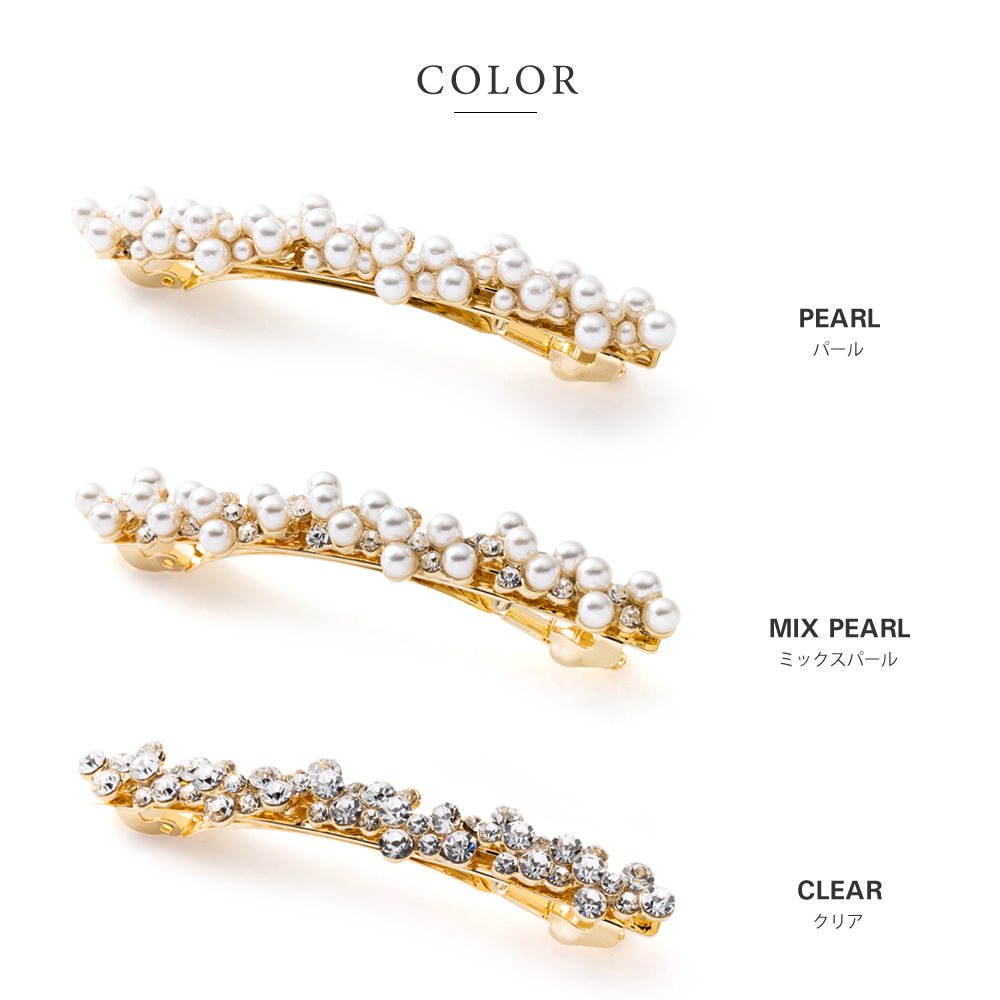 パール/ビジューが煌めくデコラティブなバレッタ。女性らしいデザインと程よいサイズ感で上品な雰囲気を演出します。普段使いはもちろん、パーティーシーンや特別な日の装いにもぴったりなひと品です◎
