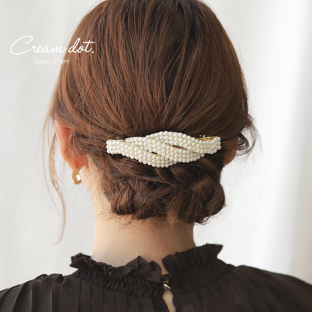 上品な3連パールツイストのウェーブバレッタ。ボリューム感のあるパールが後ろ姿に女性らしい華やぎをプラスしてくれます。結婚式やパーティーシーンなど特別な日にオススメ◎丁寧な作りで長くご使用いただけます。