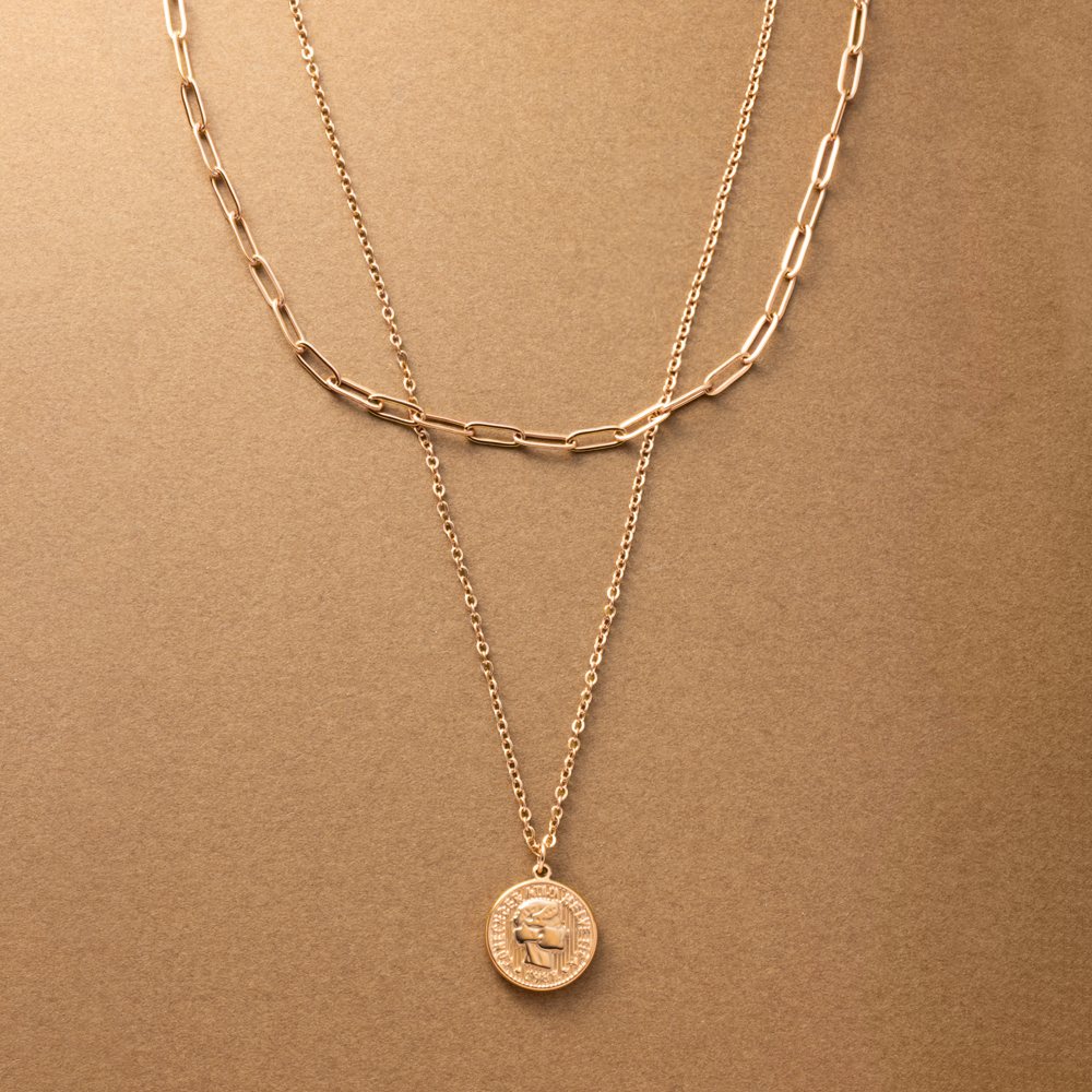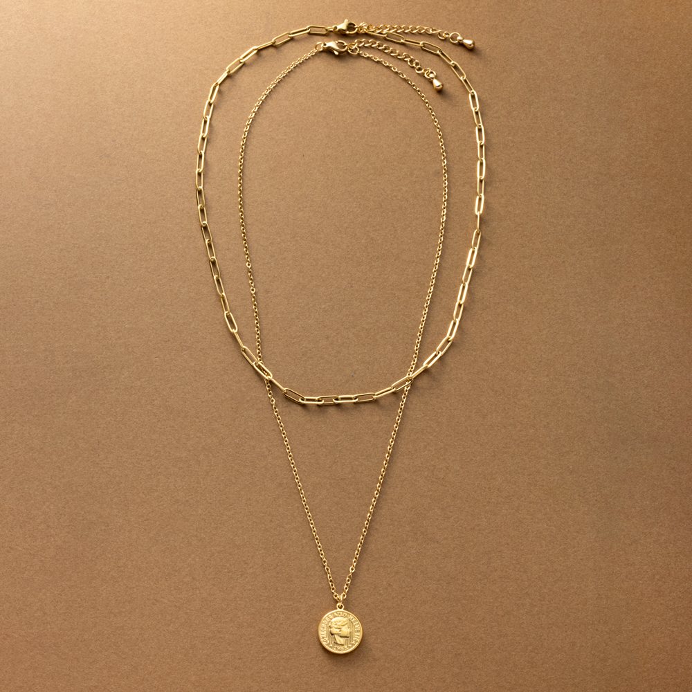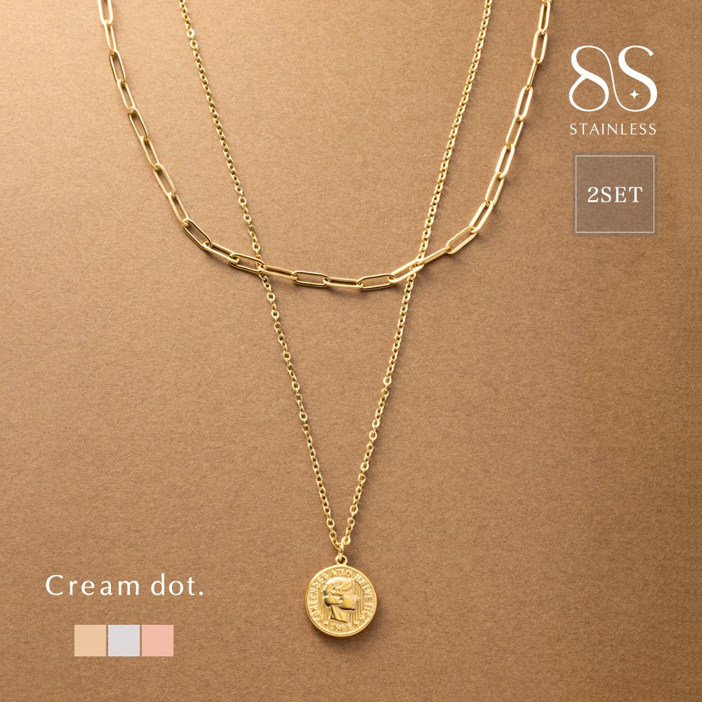 コインモチーフ&オーバルチェーンの2セットネックレス。重ねての着用はもちろん、それぞれ単品でもお使い頂ける嬉しい3WAY仕様◎錆びにくく傷に強いステンレス製で、デイリーに使える組み合わせがひと品です。