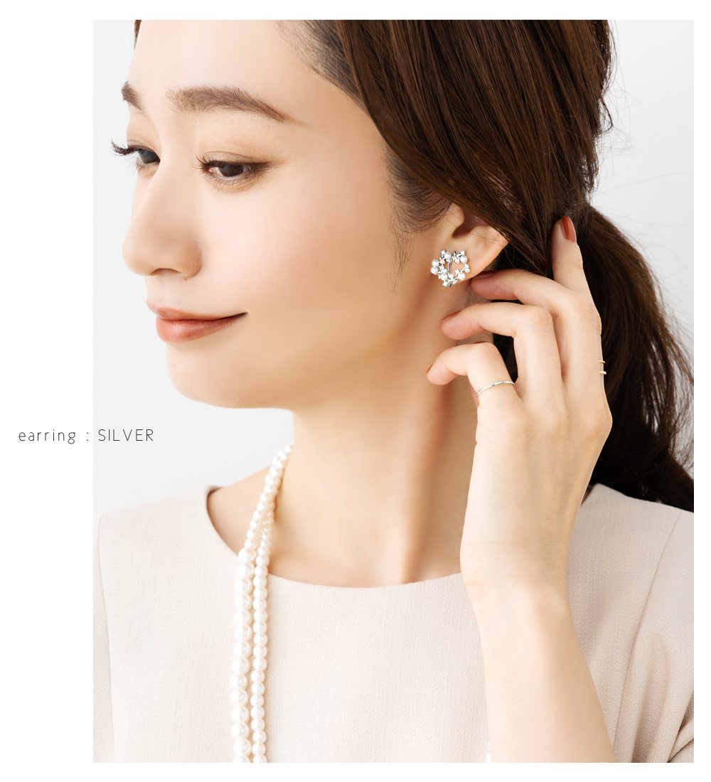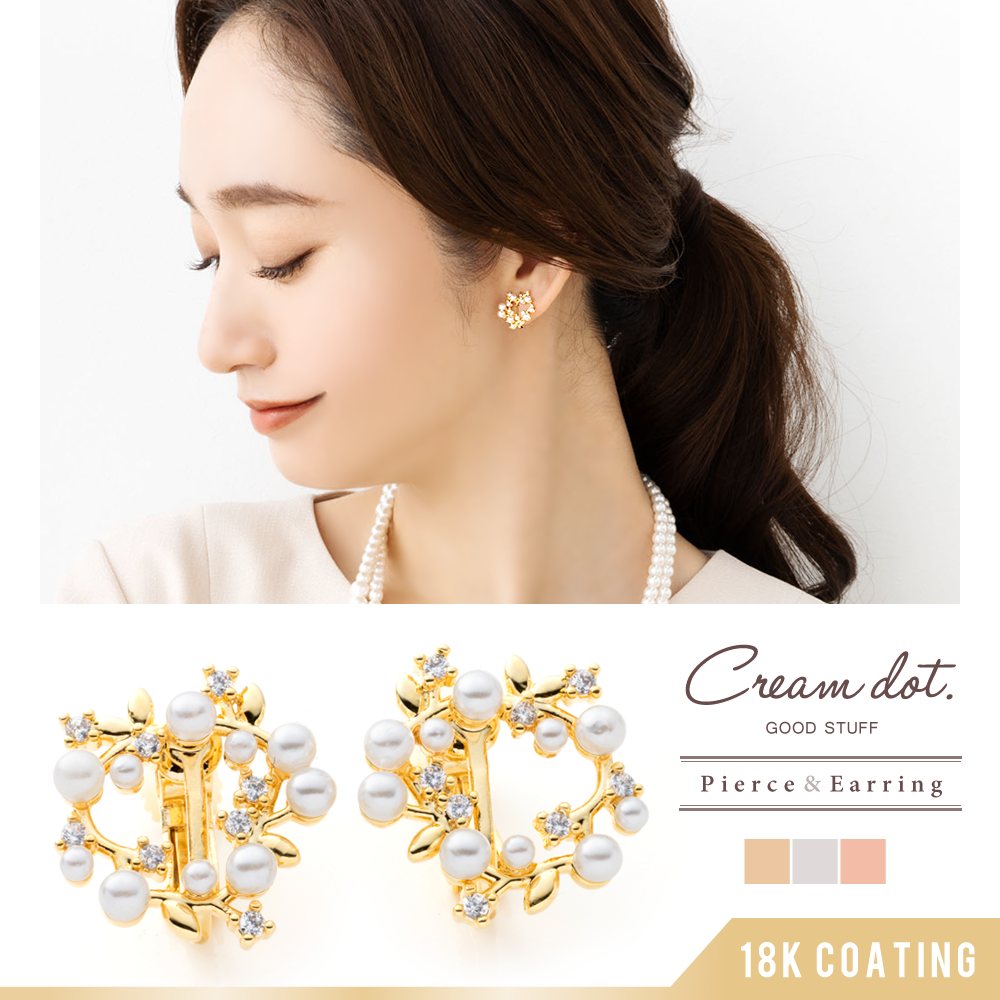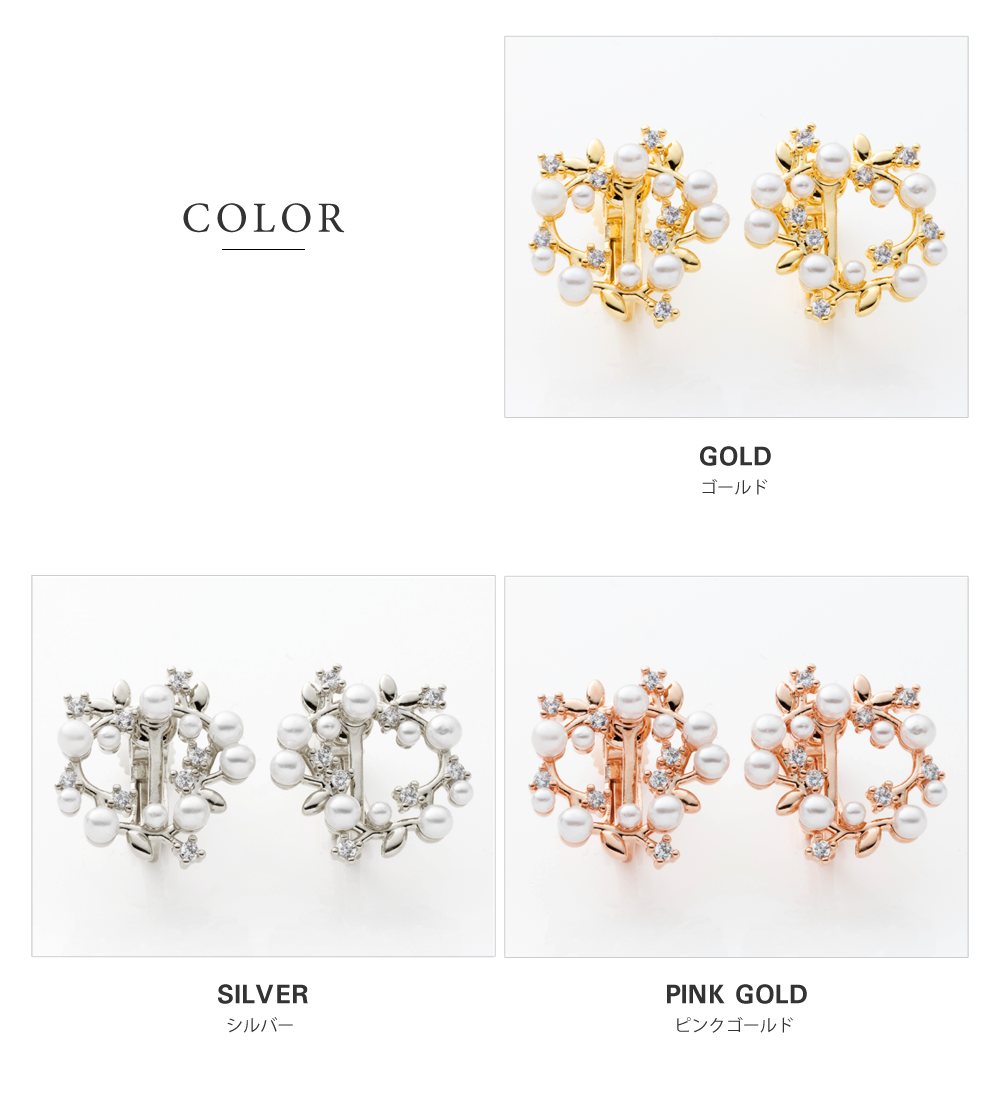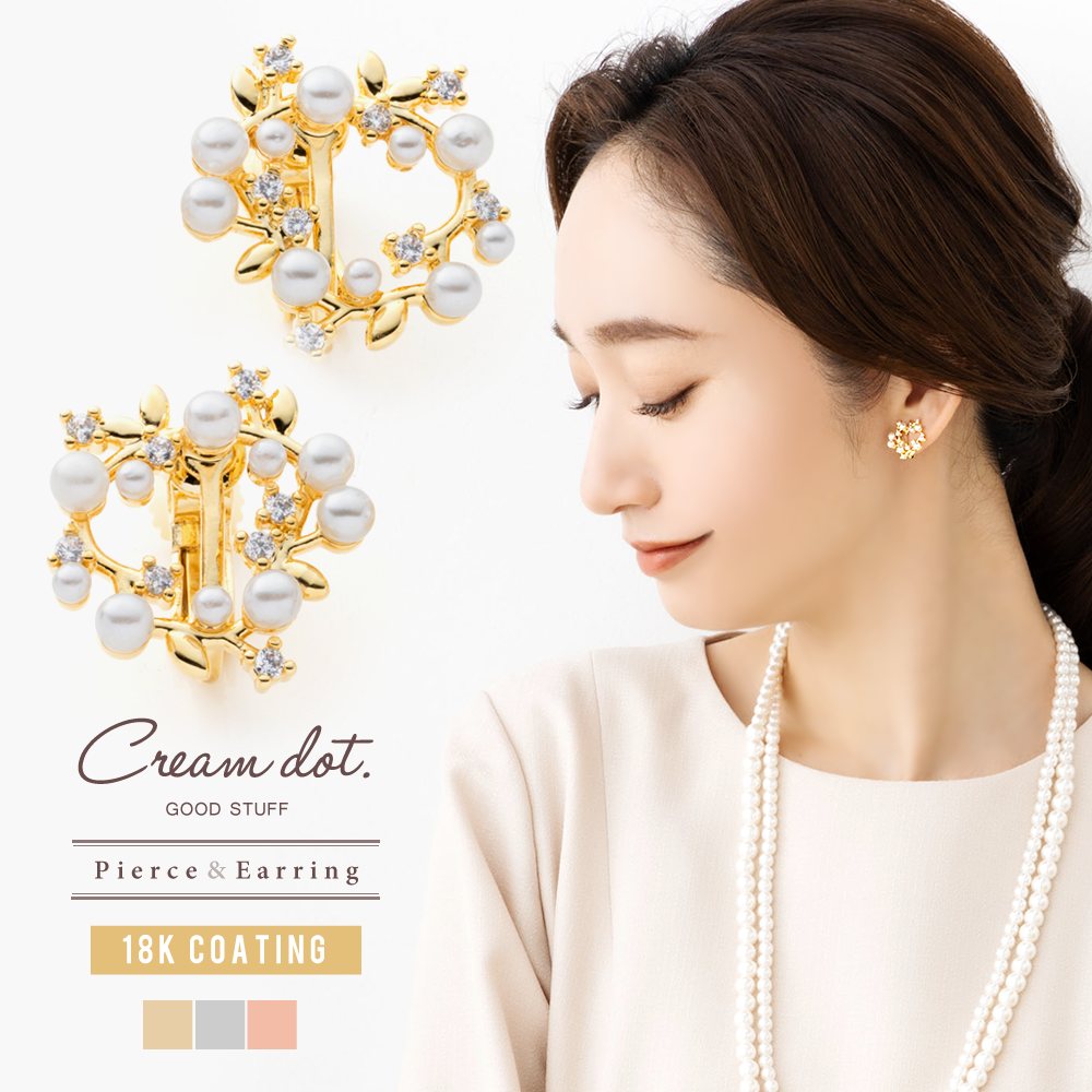 パール&リーフモチーフのサークルイヤリング/ピアス。小粒パールやリーフを散りばめたフラワーリース
