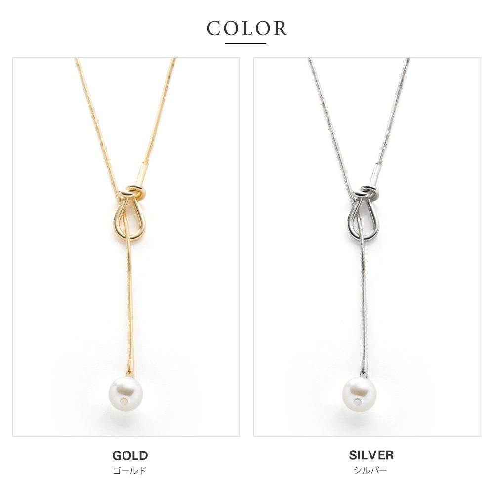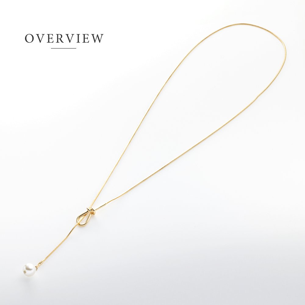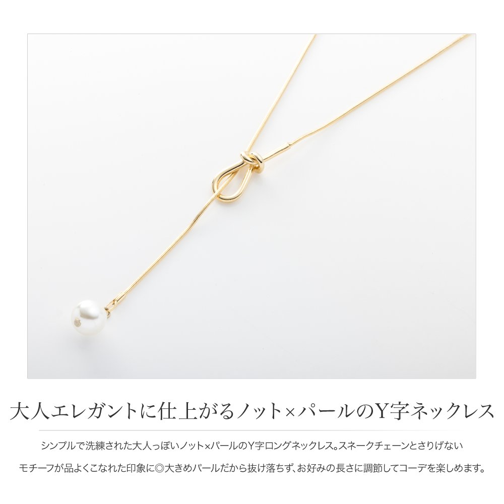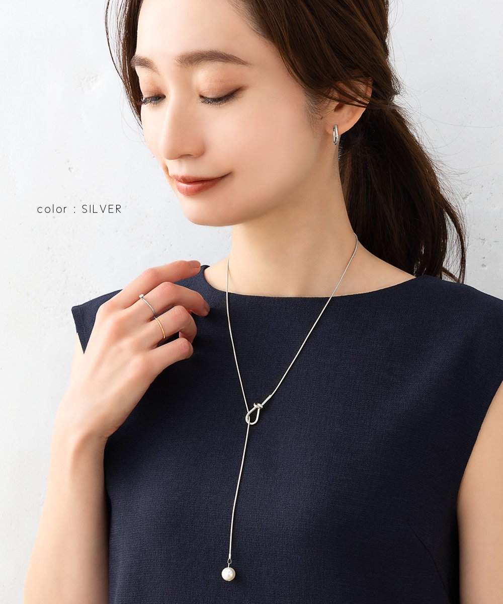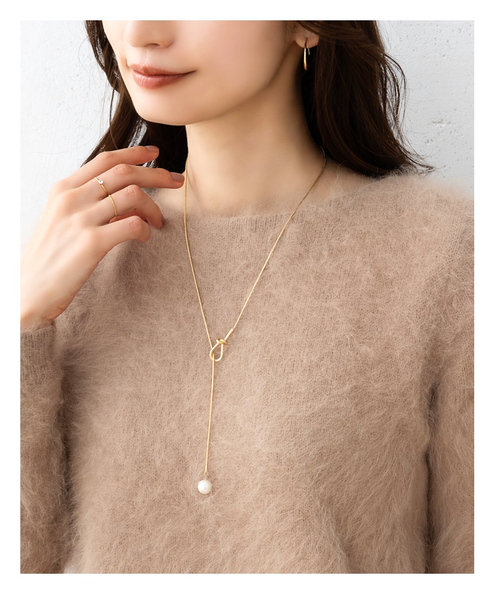シンプルで洗練された大人っぽいノット×パールのY字ロングネックレス。スネークチェーンとさりげないモチーフが品よくこなれた印象に◎大きめパールだから抜け落ちず、お好みの長さに調節してコーデを楽しめます。