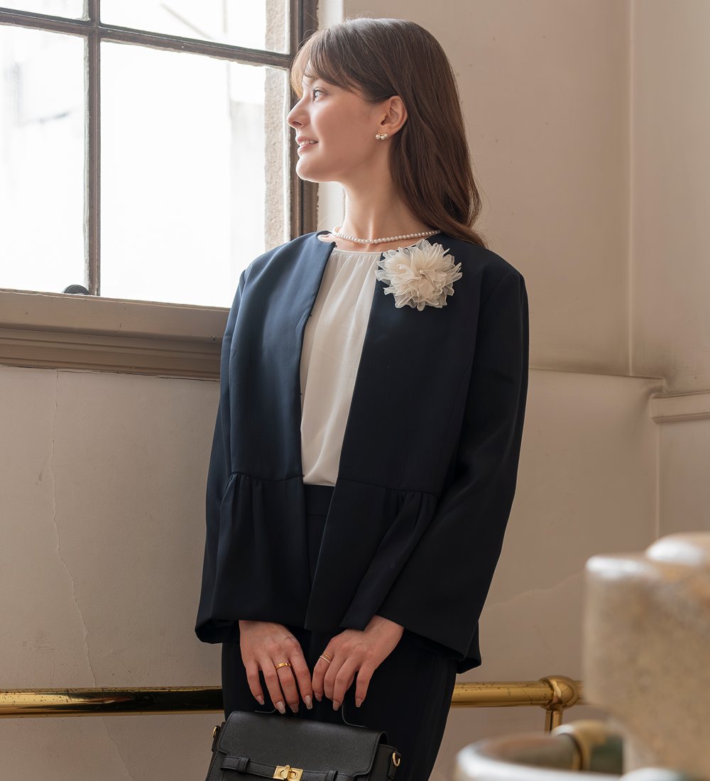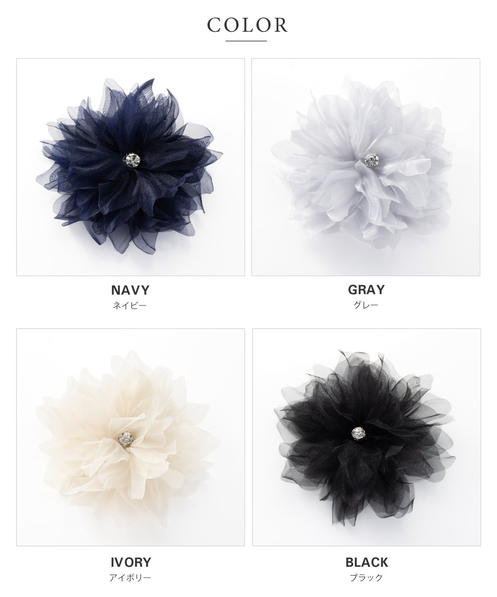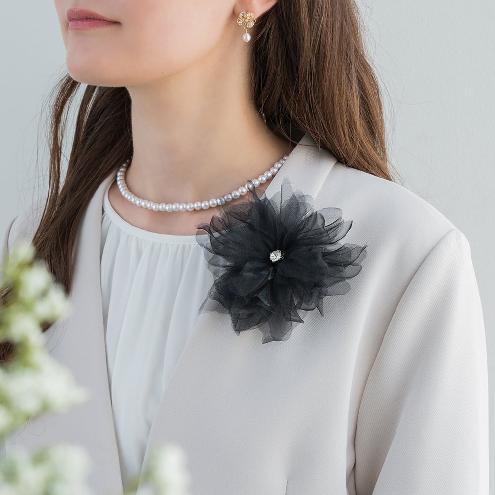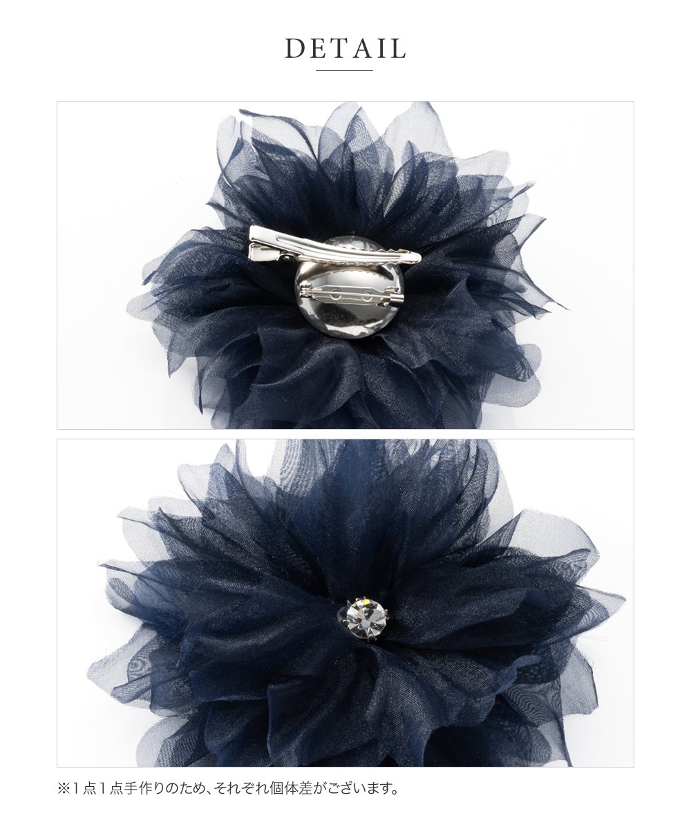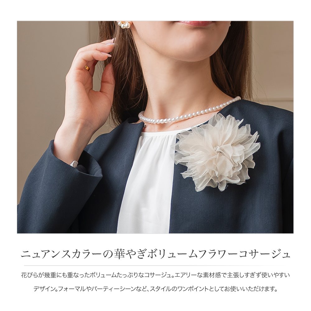 花びらが幾重にも重なったボリュームたっぷりなコサージュ。エアリーな素材感で主張しすぎず使いやすいデザイン。フォーマルやパーティーシーンなど、スタイルのワンポイントとしてお使いいただけます。