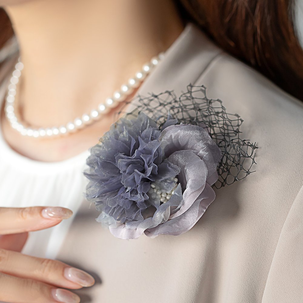 2つの花を組み合わせた、バイカラーのフラワーコサージュ。上品な色合いと、レースと小粒パールをあしらったデザインがエレガントな雰囲気を演出。ほどよい存在感でセレモニーやドレス・スーツなど様々な装いにオススメです。