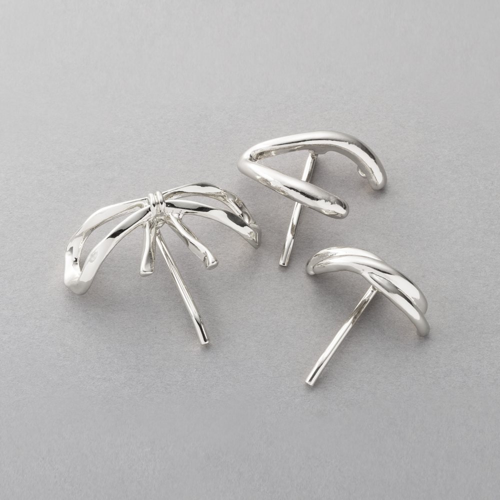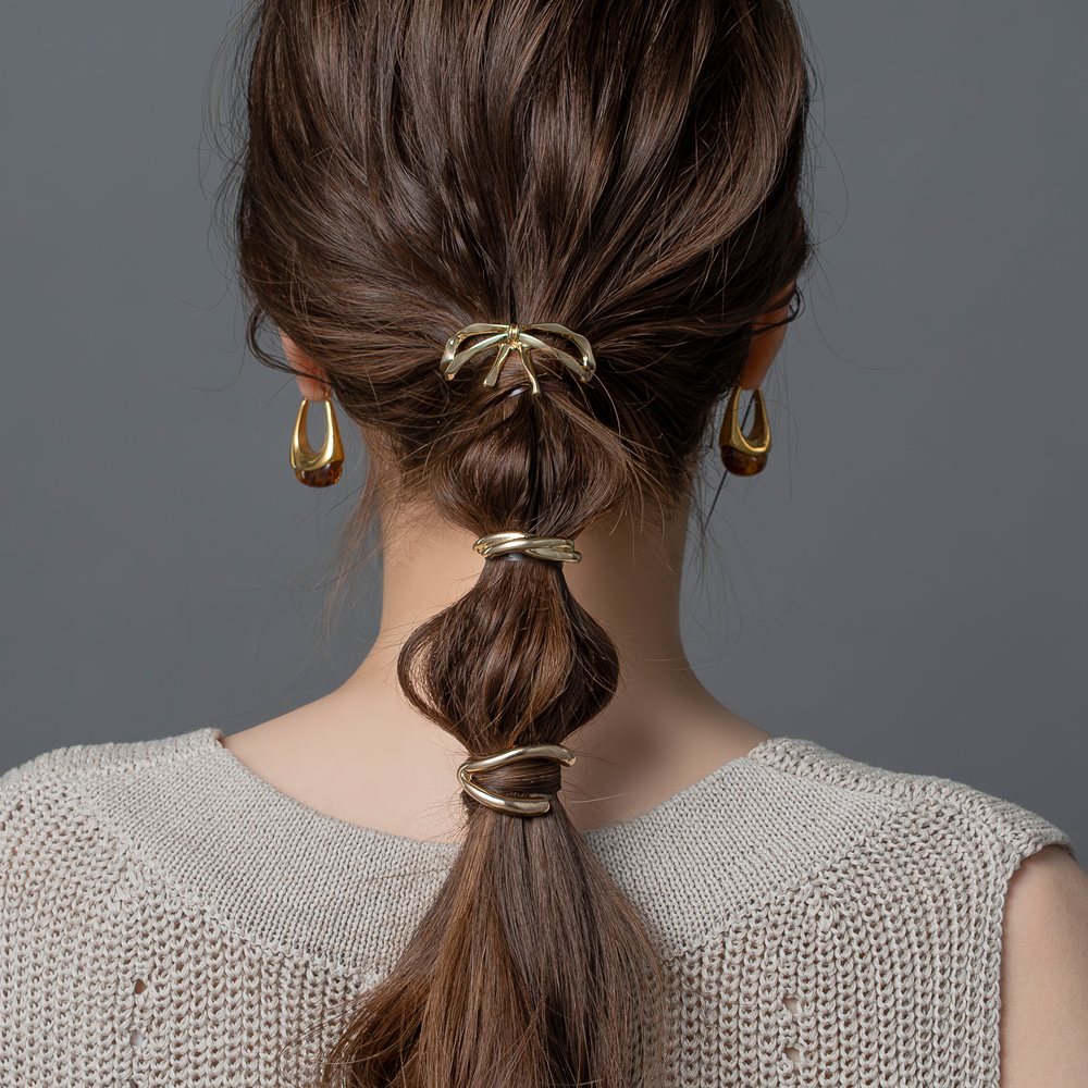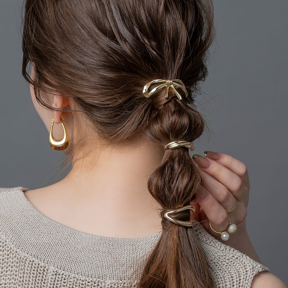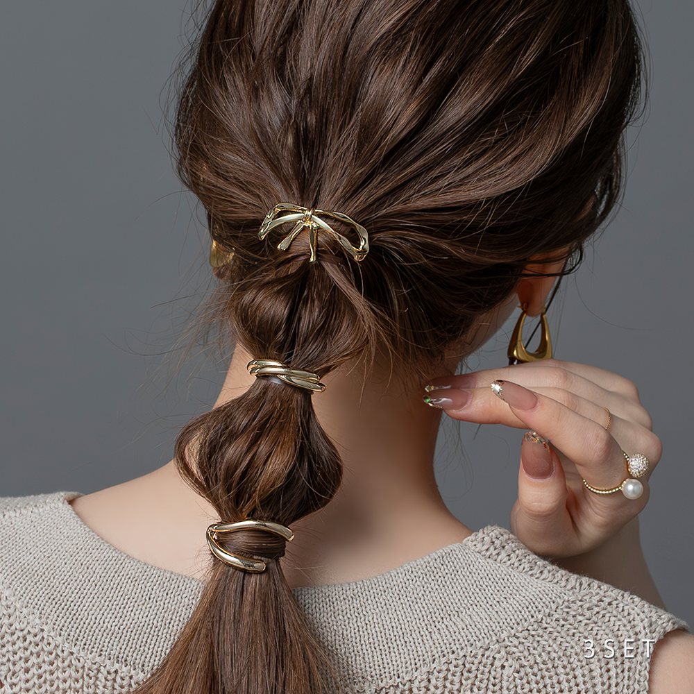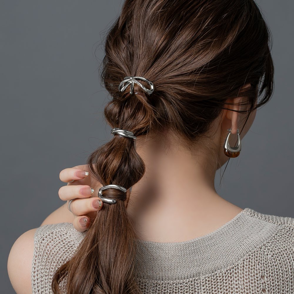 リボンモチーフ・カーブラインやひねりデザインなど、異なるデザインの3セットメタルポニーフック。編み下ろしや玉ねぎアレンジに飾るだけで旬のヘアが完成します。それぞれニュアンスのあるデザインなので、単品使いも◎これひとつでぐっとコーデの幅が広がりそう。
