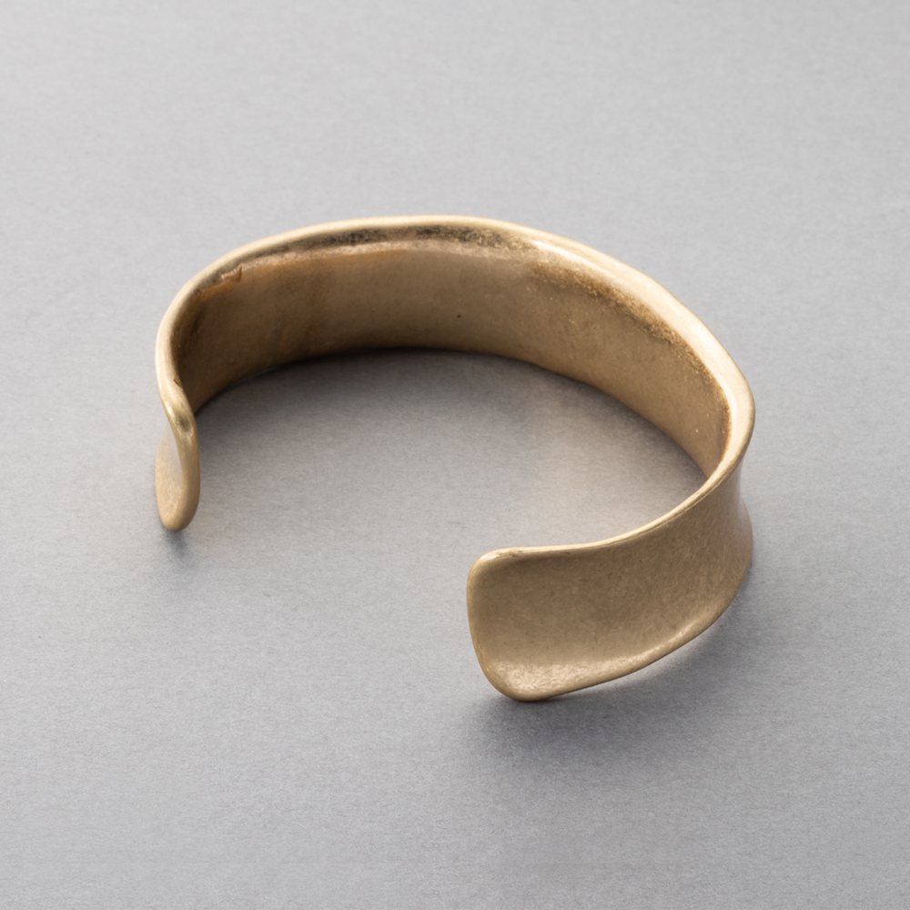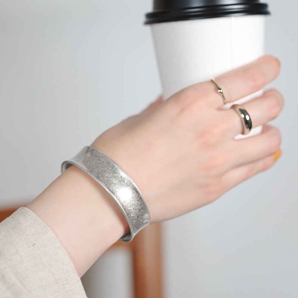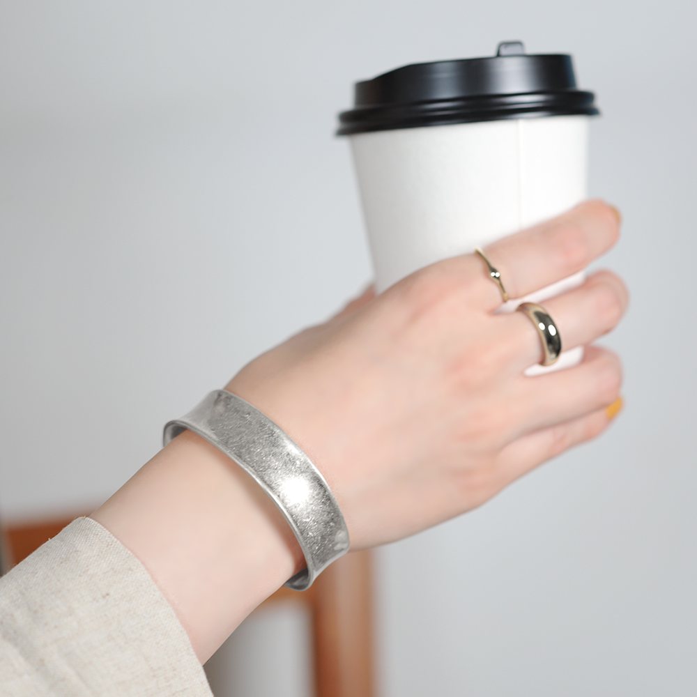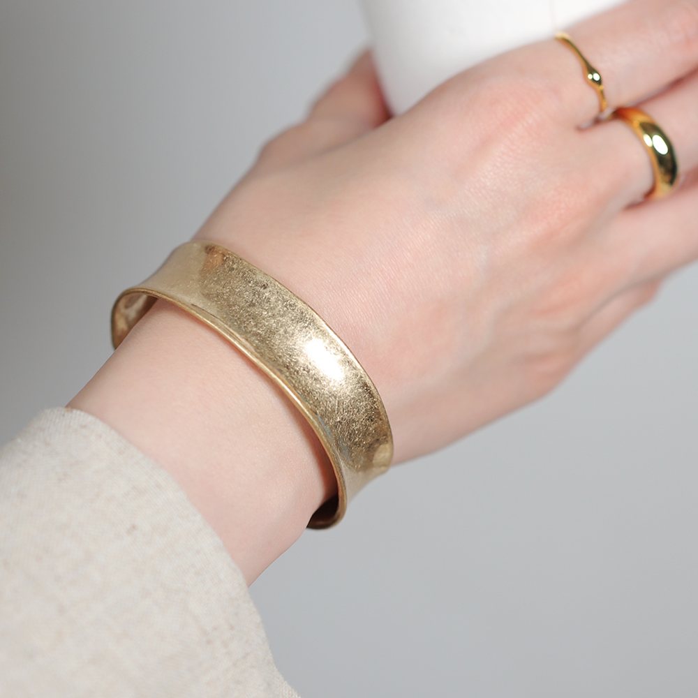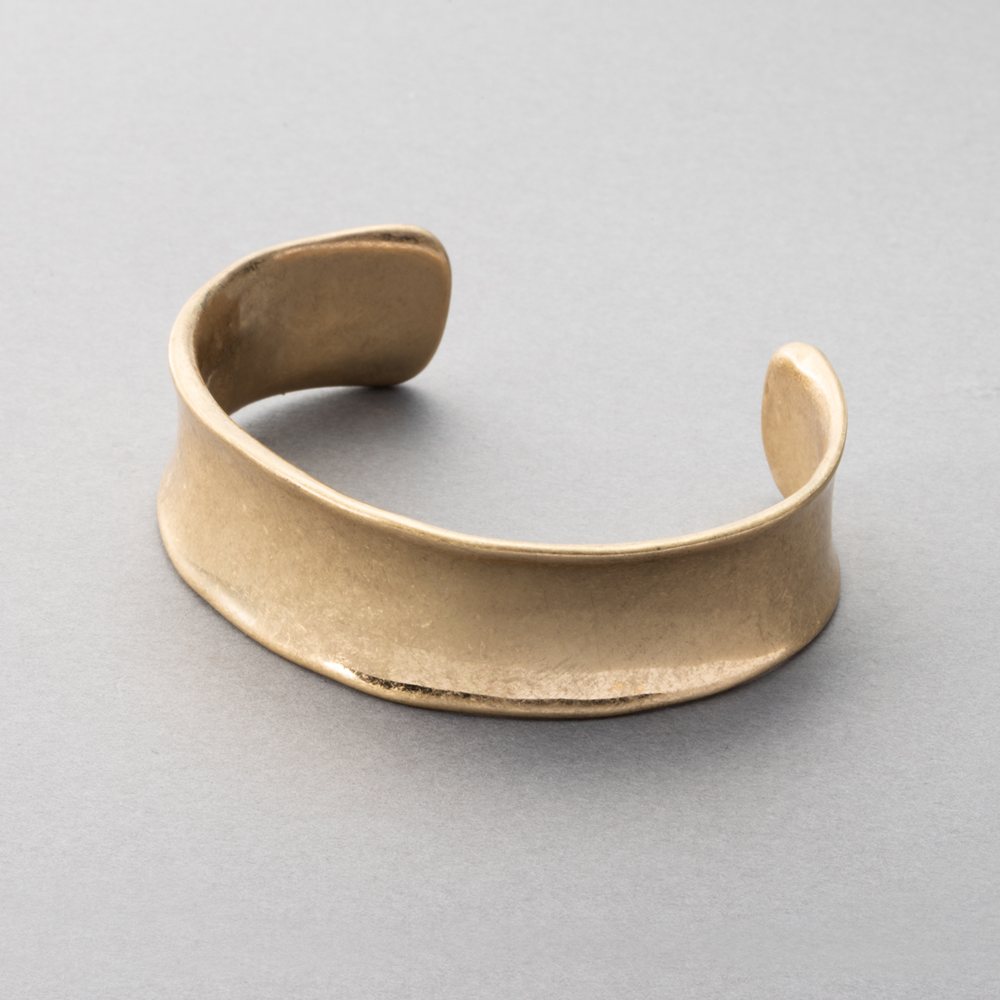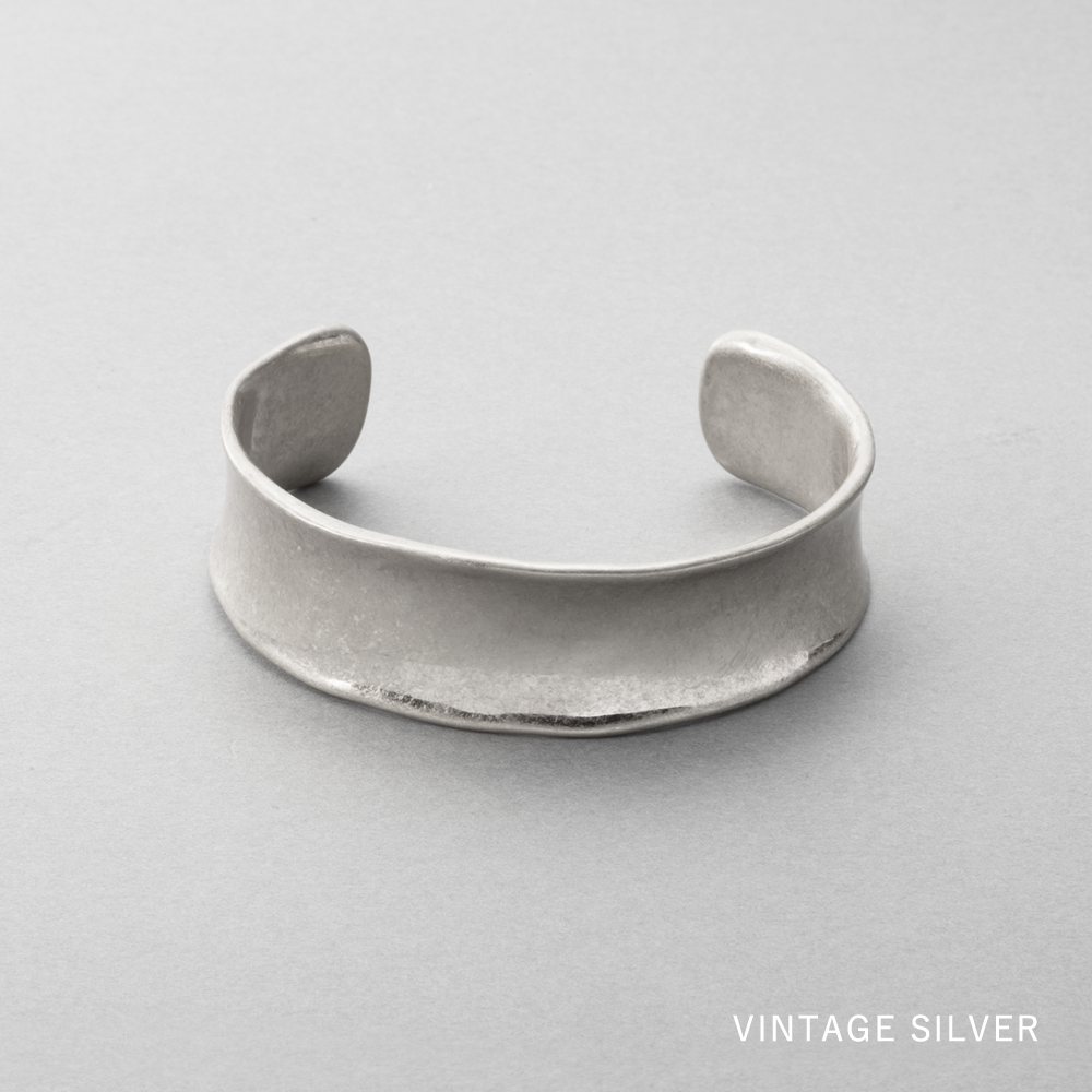 カーブメタルのヴィンテージ調オープンバングル。少しくびれたカーブラインと幅広なフォルムが、いつものスタイルを大人モードにクラスアップ。表面に加工を施したセミマットな質感がヴィンテージライクな逸品です。