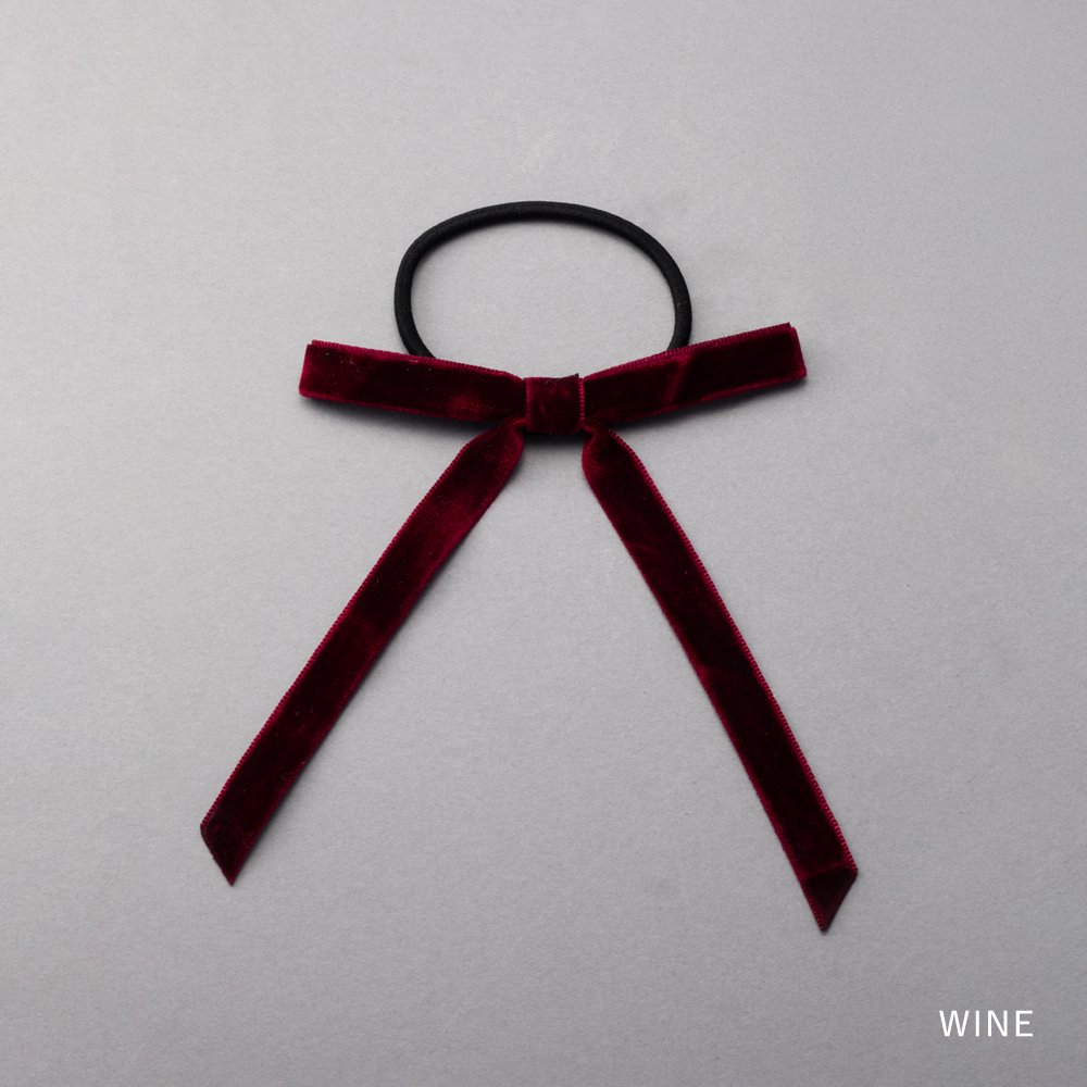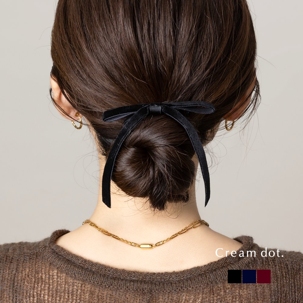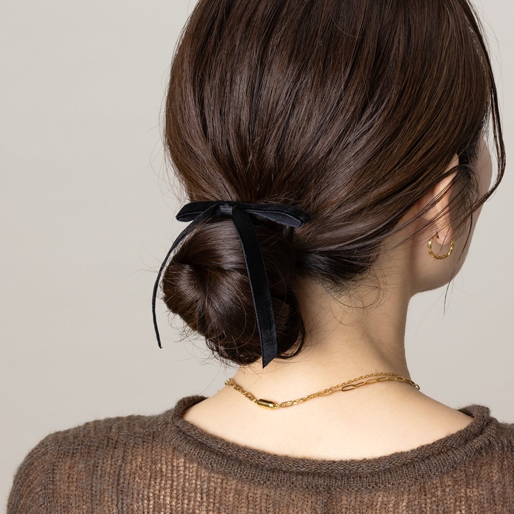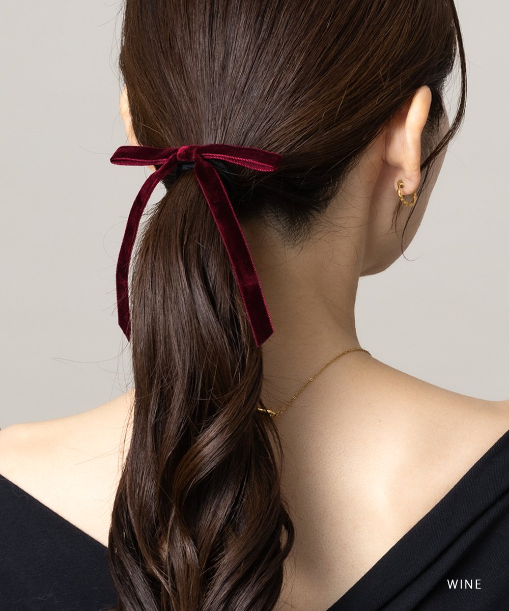 微光沢が上品なベロア調生地のリボンヘアゴム。深みのあるカラーと細めのシルエットが、大人の女性にもさりげなく取り入れやすいデザイン◎後ろ姿にこなれたアクセントを添えてくれる一品です。