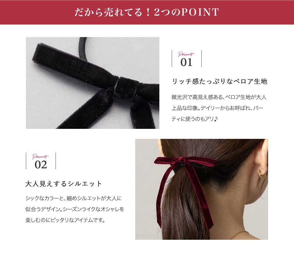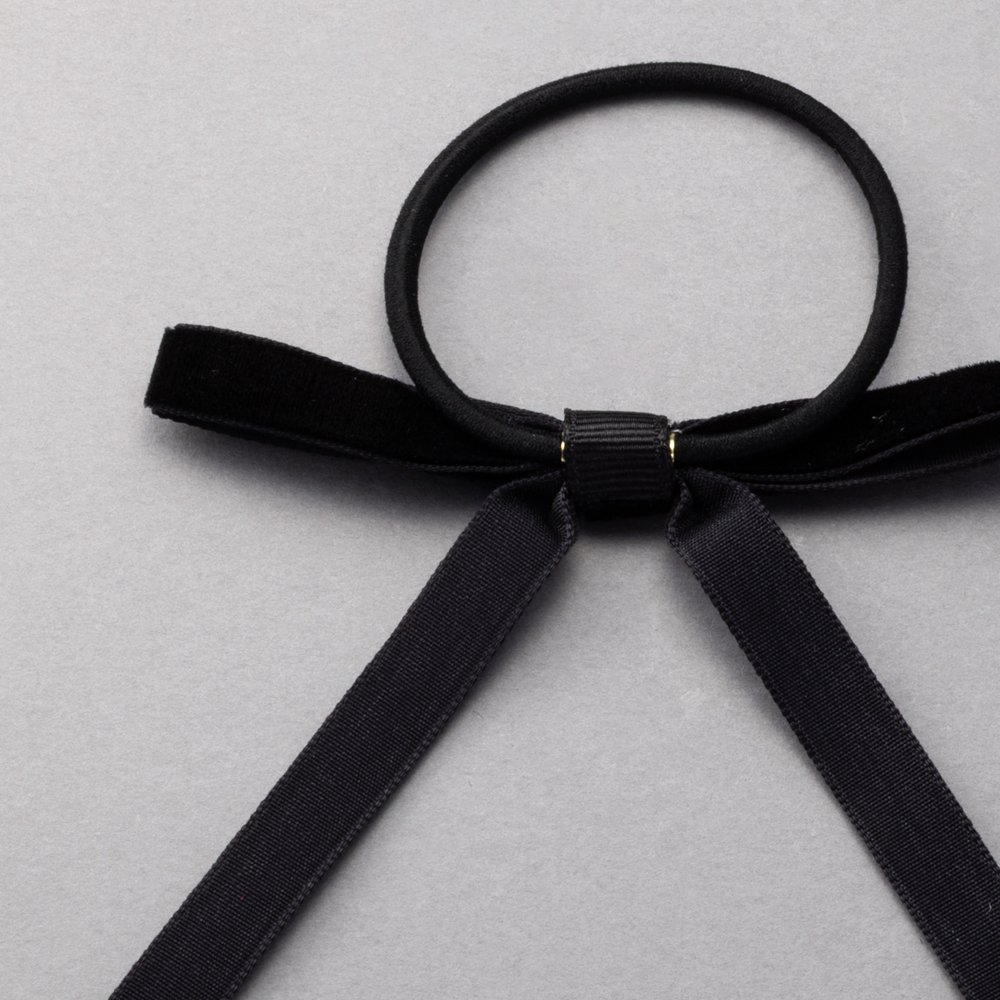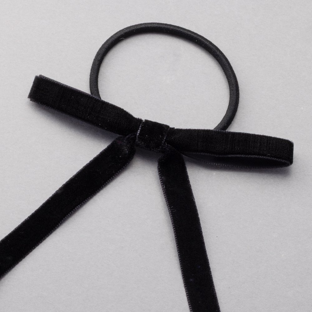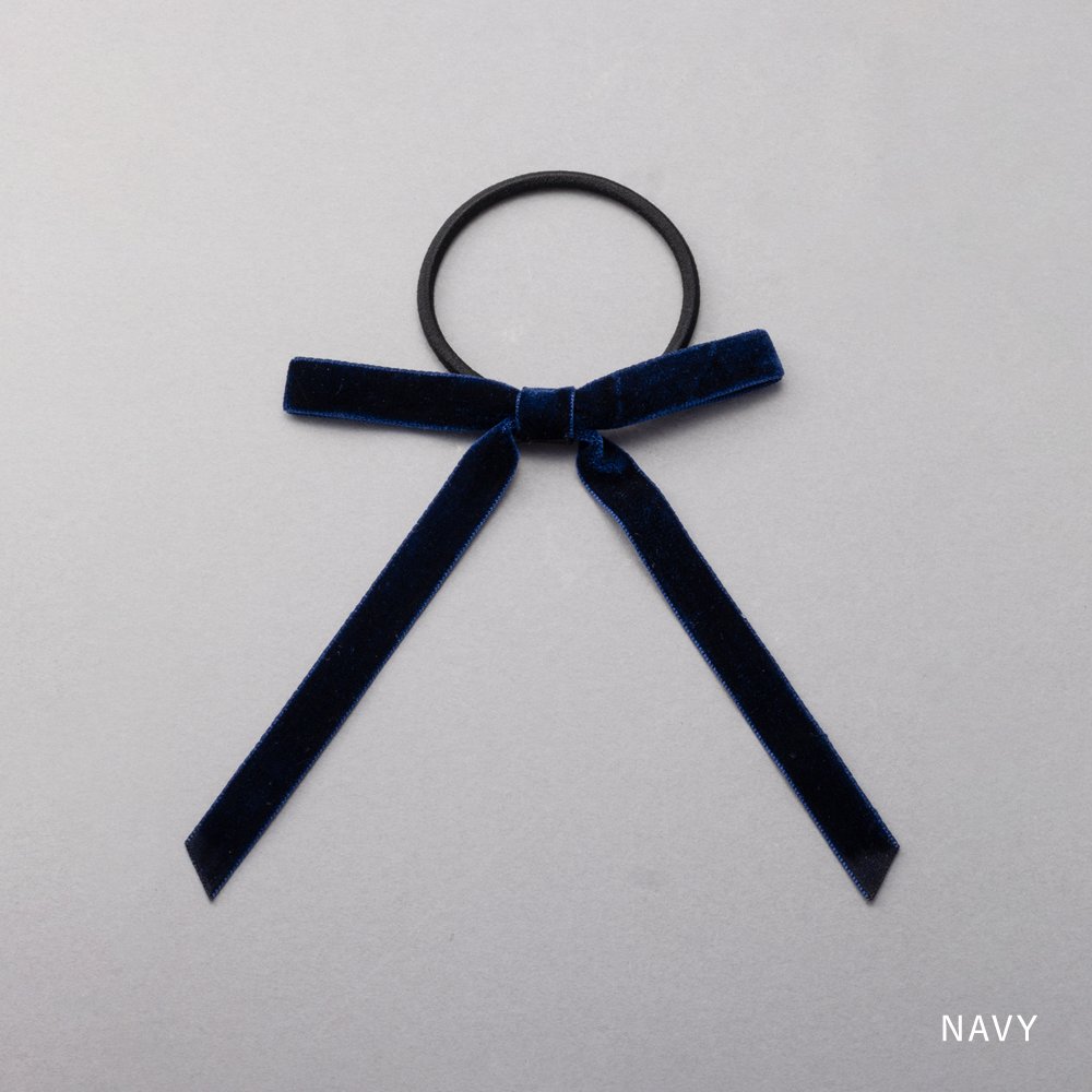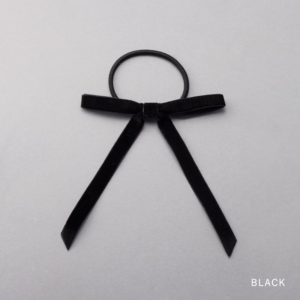 微光沢が上品なベロア調生地のリボンヘアゴム。深みのあるカラーと細めのシルエットが、大人の女性にもさりげなく取り入れやすいデザイン◎後ろ姿にこなれたアクセントを添えてくれる一品です。