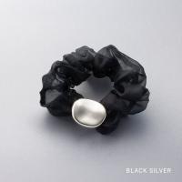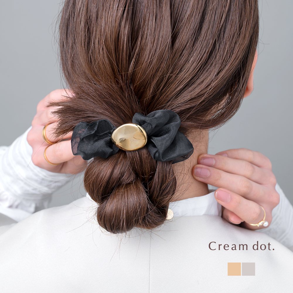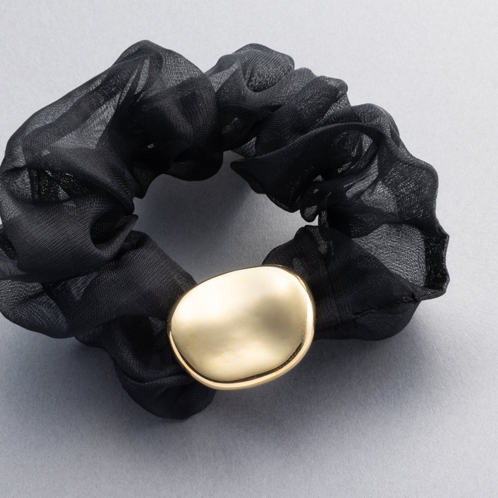 クラフト感ある歪なメタルが煌めくシュシュ。透け感のあるオーガンジー素材で、ブラックカラーでも重たくならずに抜け感のあるデザインです。シンプルだけどサッと着けるだけでワンポイントになるひと品◎