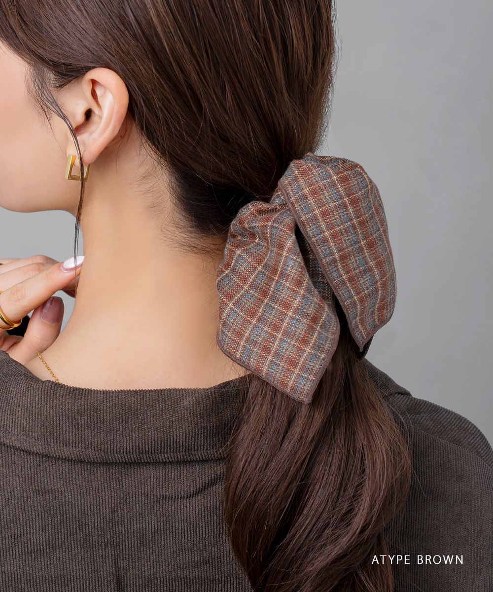 着けた時にこなれ感たっぷりなシルエットに仕上がるスクエアシュシュ。サッと結ぶだけで今っぽく仕上がるオススメのアイテムです。落ち着いた大人色で使い勝手の良い全5色展開◎