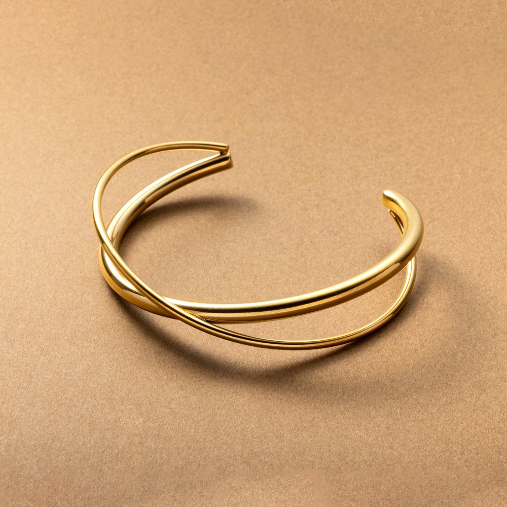 幅の異なるメタルラインがクロスしたバングル。高級感漂うデザインが手元にこなれ感をプラスし、洗練された印象に仕上げてくれます。錆びにくいステンレス製で着脱しやすくデイリーに活躍しそう。