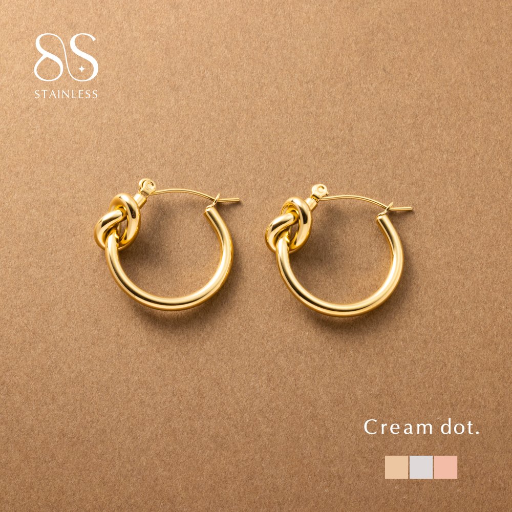 フープとノットモチーフが一体になったキャッチレスピアス。シンプルなラインとさりげなく個性的なデザインが大人コーデにぴったりなアイテムです。着脱しやすいワンタッチ&錆びにくく傷に強いステンレス製でデイリーに活躍間違ナシ◎