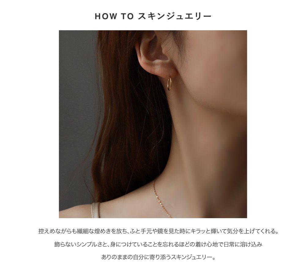 着けていることを忘れるくらい素肌に馴染む軽やかさ。お風呂や寝る時にもつけっぱなしOK!ボディとキャッチが一体になっているため、引っ掛かりの心配もありません。