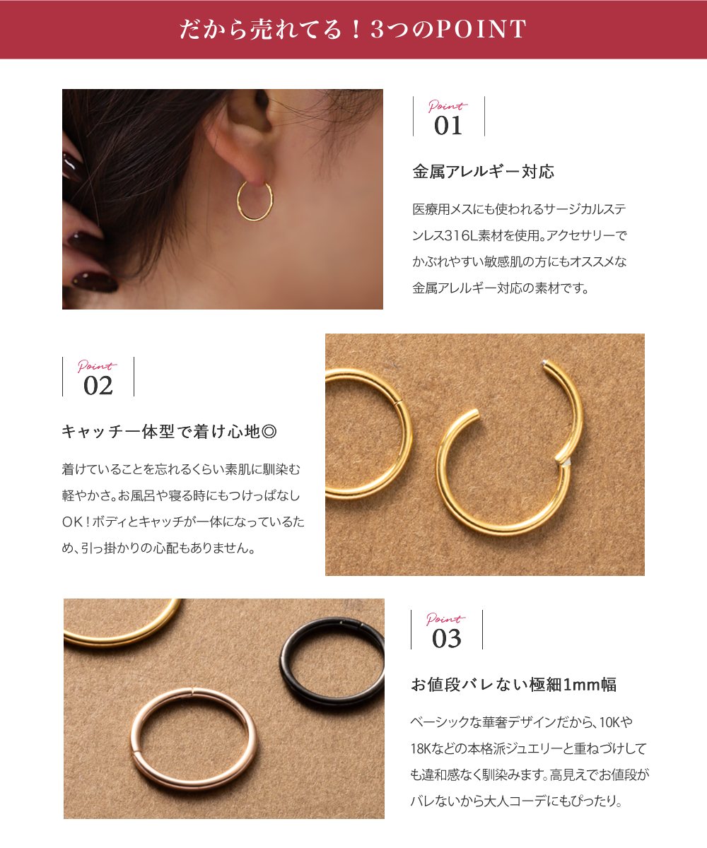 【本日限定!全品10%OFFクーポン】ステンレス製 両耳用 ピアス 金属アレルギー フープピアス 極細 1mm幅 7サイズ 中折れ キャッチレス リング