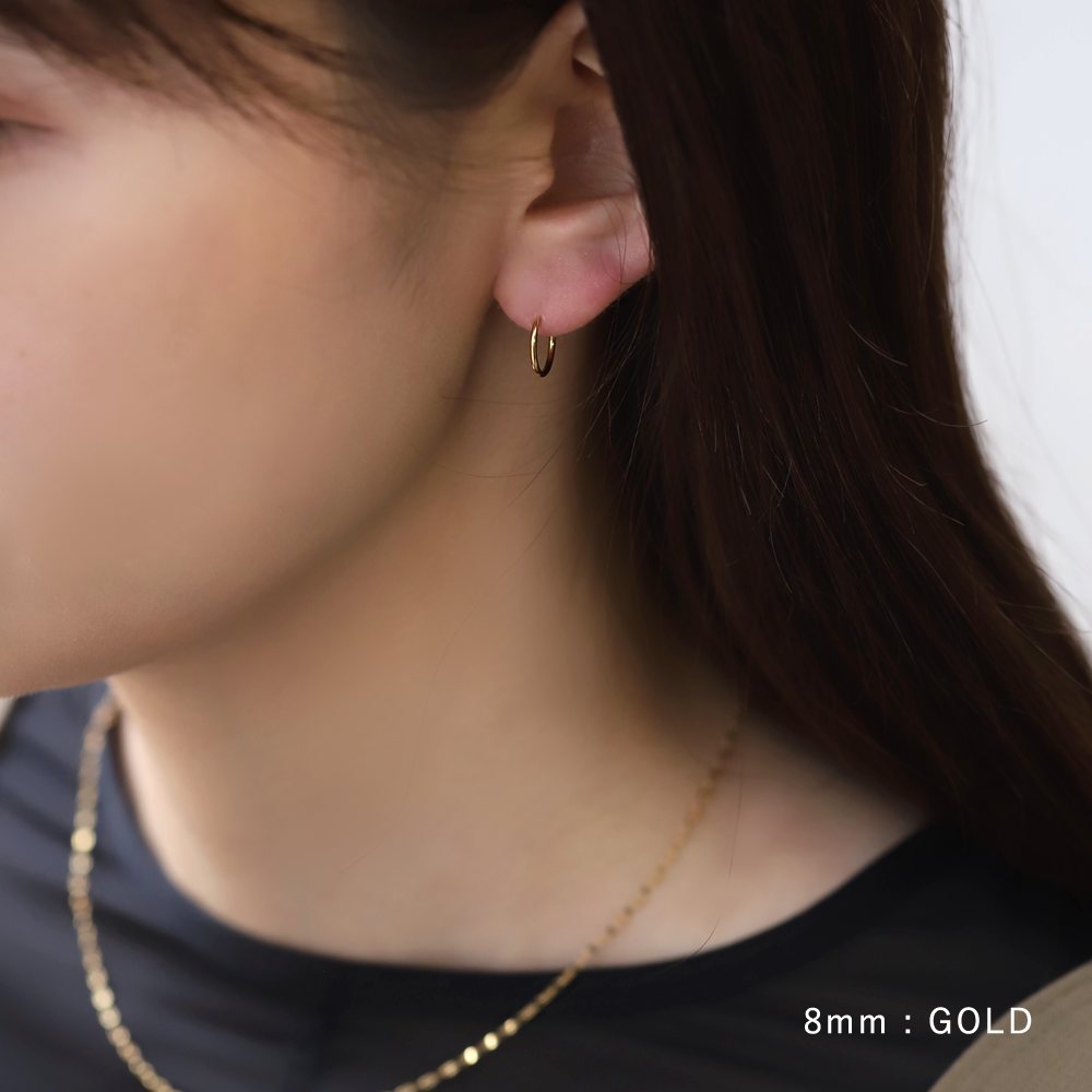 キャッチ一体型の極細ラインが素肌に馴染むフープピアス。使い回せるシンプルなデザインでデイリーに活躍します。他のピアスやイヤーカフとの重ねづけにもオススメ。錆びにくく、金属アレルギー対応のステンレス素材を使用しています。