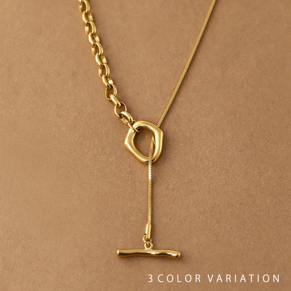 しなやかなスネークチェーンと存在感のあるサークルチェーンを組み合わせたY字ロングネックレス。クラフト感のあるエンドパーツとマンテルが大人モダンな印象に仕上げてくれます。2連にしてもお使いいただけるので、スタイリングに合わせて楽しめます。錆びにくいステンレス製だからデイリー使いにぴったりの一品です。