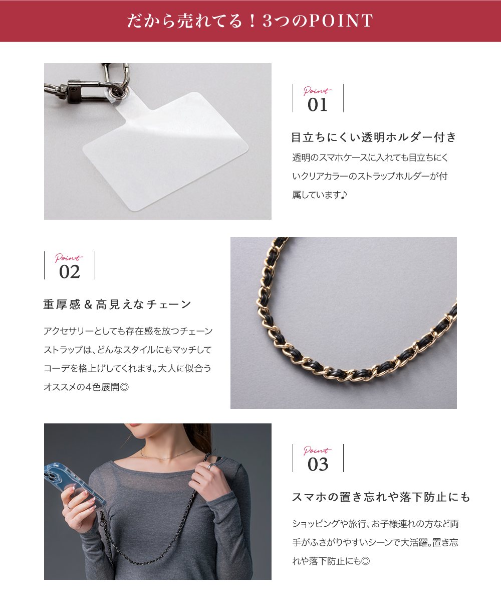 スマホショルダー ストラップホルダー チェーン フェイクレザー 挟むだけ ホルダー付き ネックストラップ ゆうパケットOK outlet