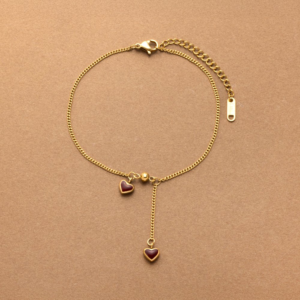 ぷっくりとしたダブルハートが大人可愛いアンクレット。シックなレッドブラウンの色味と小ぶりなサイジングで甘さ控えめなモチーフ。錆びにくく傷に強いステンレス製で、長時間の着用も安心の低アレルギー素材です。