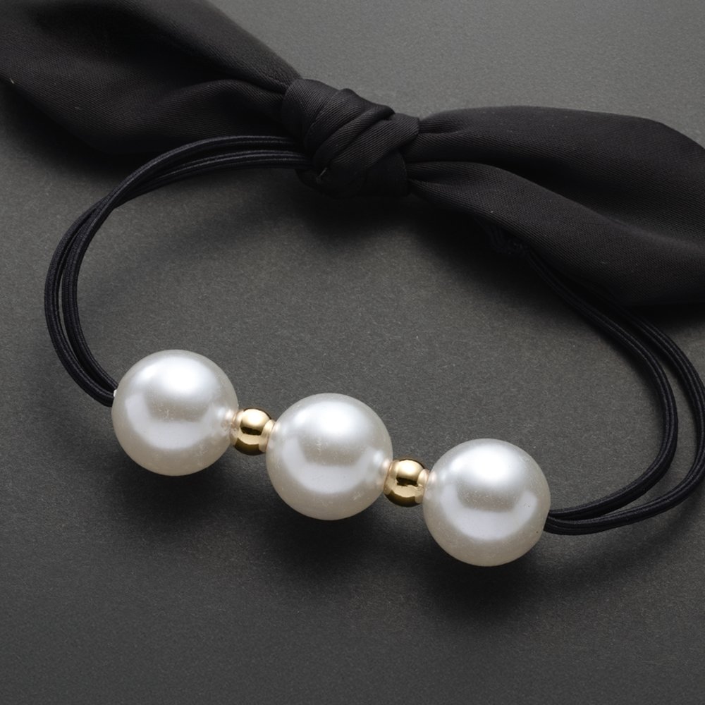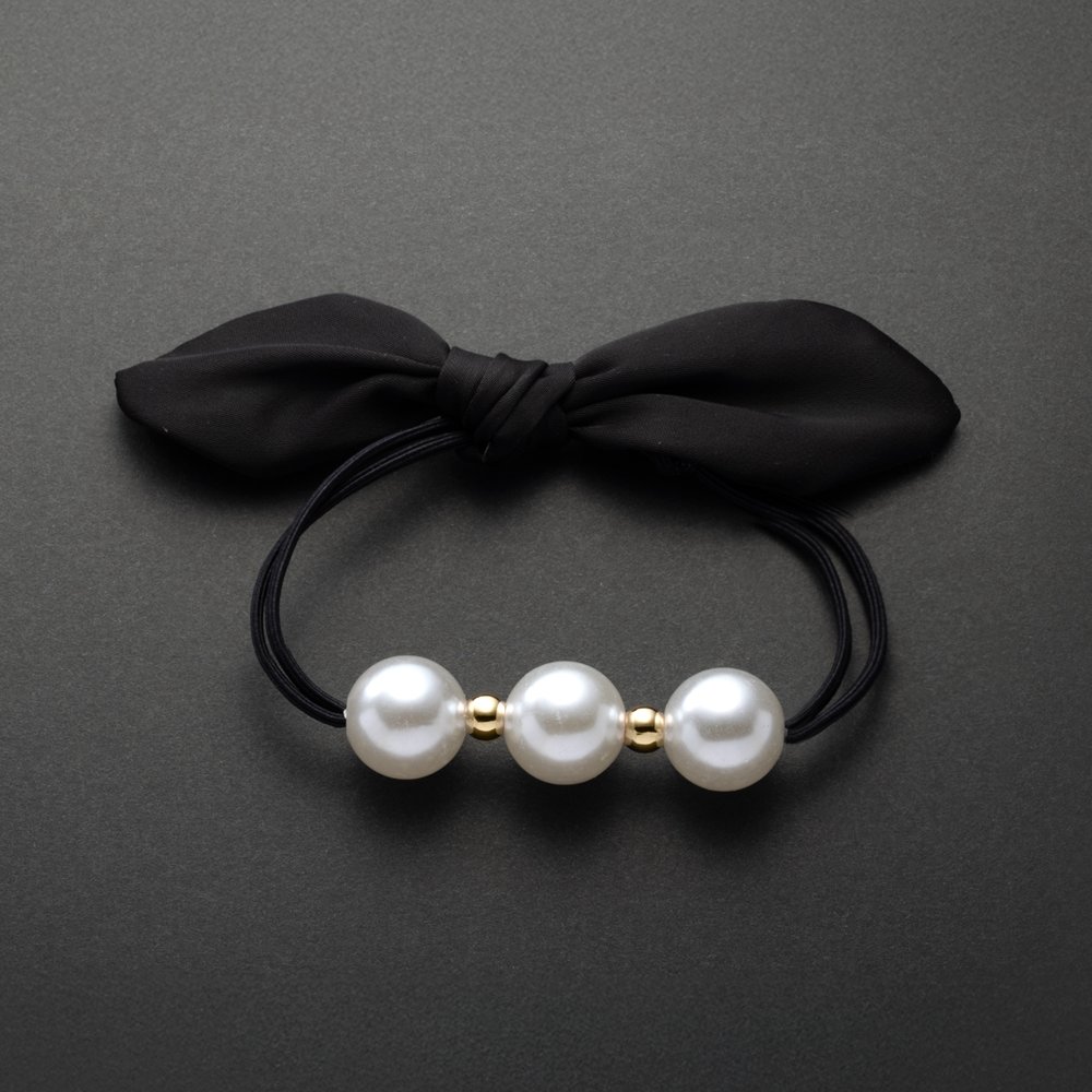 パールとリボンのヘアゴム。3つ並んだ艶めくパールと、さりげないリボンが大人の女性にも取り入れやすいアイテムです。程よく華やかなデザインがアクセント使いにピッタリ◎