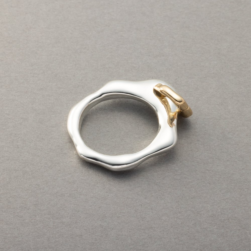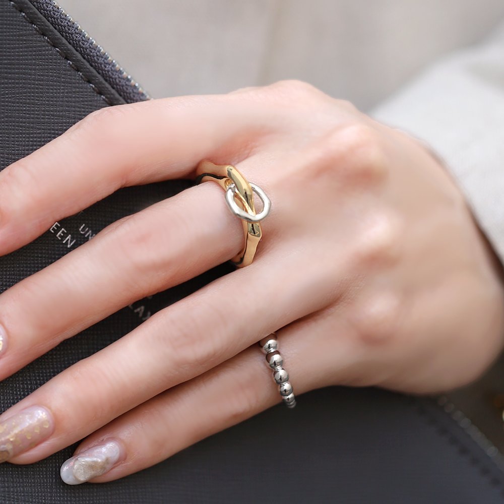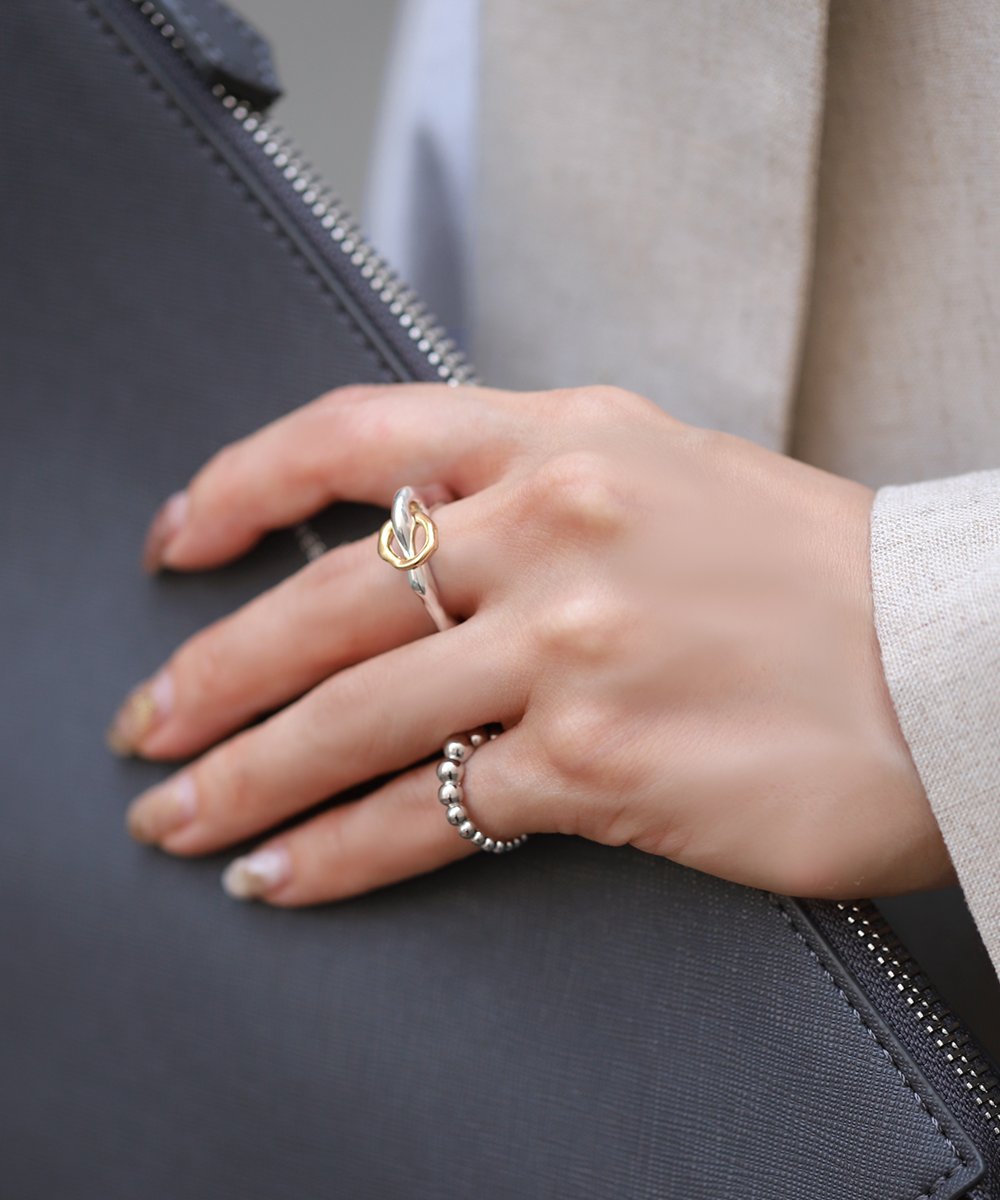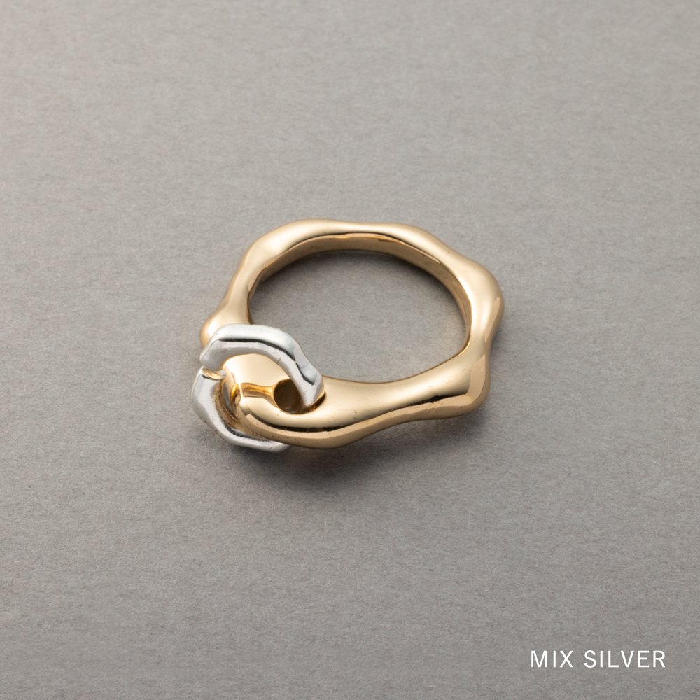 トレンドMIXカラーのニュアンスリング。いびつなカタチが癖になりそうなニュアンス感たっぷりのトレンドアイテム。トップにあしらったミニリングがチラチラと揺れてさらに主張する個性派さんのための逸品