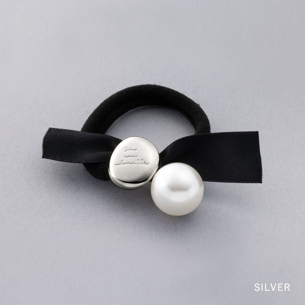 メッセージが刻印された変形メタルプレートと艶めくパールがついたリボンヘアゴム。キレイめスタイルからカジュアルまで幅広く使える大人かわいいアイテム◎サッとつけられて、後ろ姿にアクセントを添えてくれます。