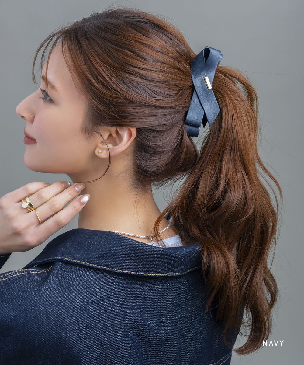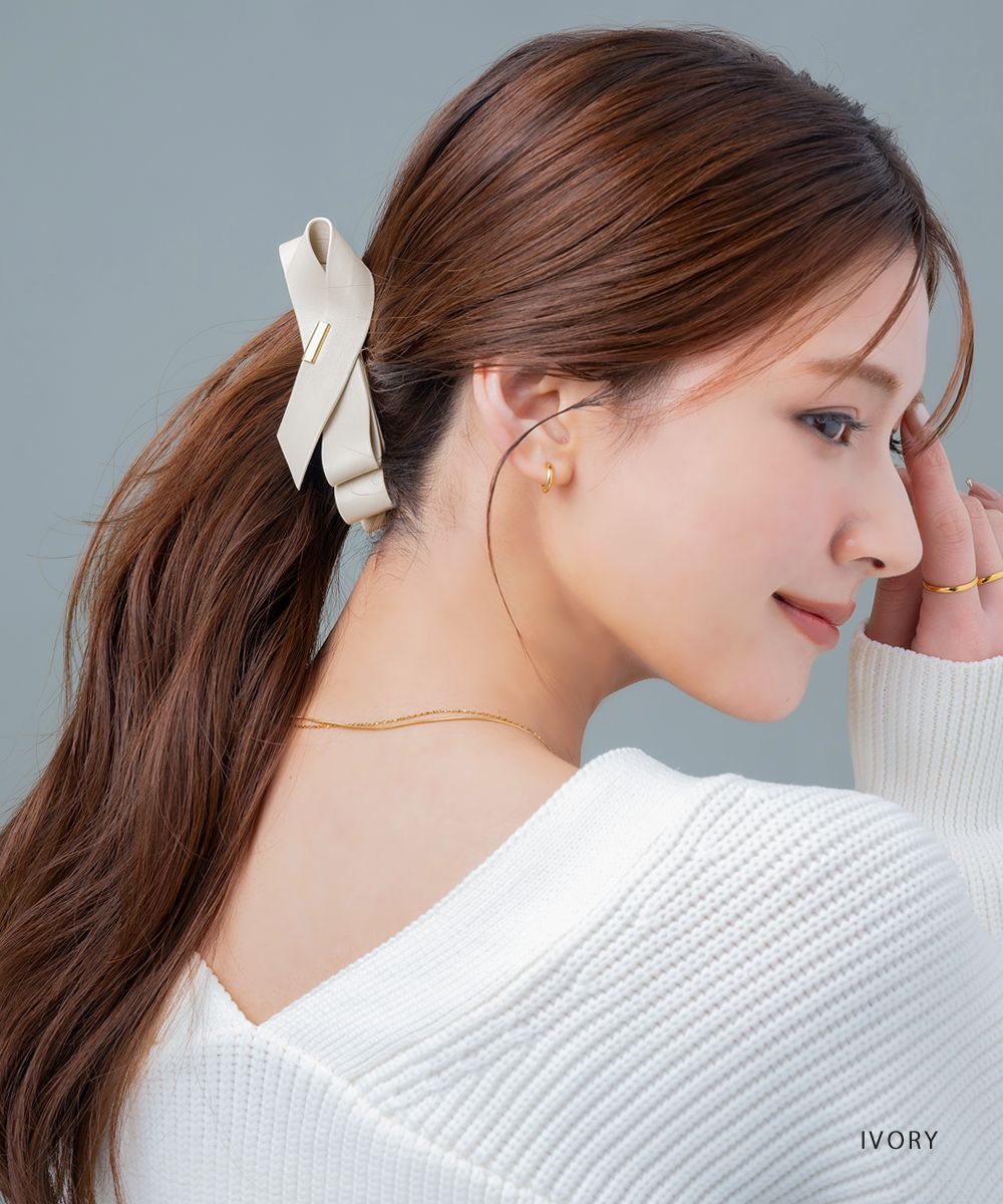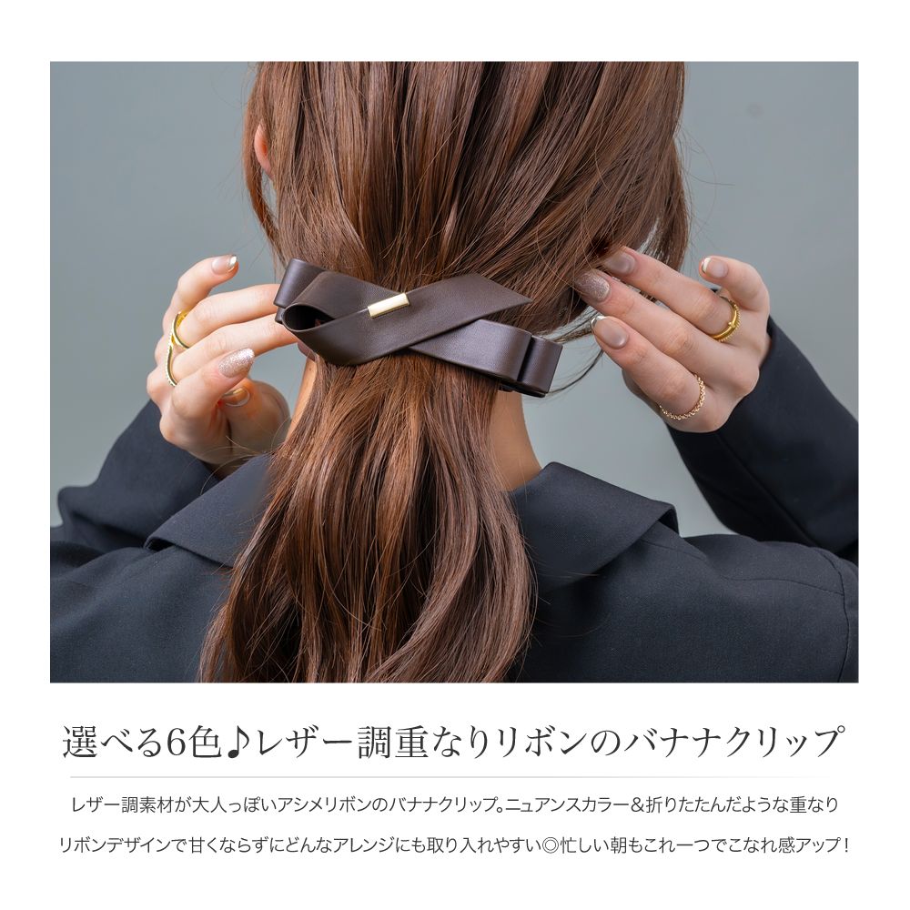 レザー調素材が大人っぽいアシメリボンのバナナクリップ。ニュアンスカラー&折りたたんだような重なりリボンデザインで甘くならずにどんなアレンジにも取り入れやすい◎忙しい朝もこれ一つでこなれ感アップ!