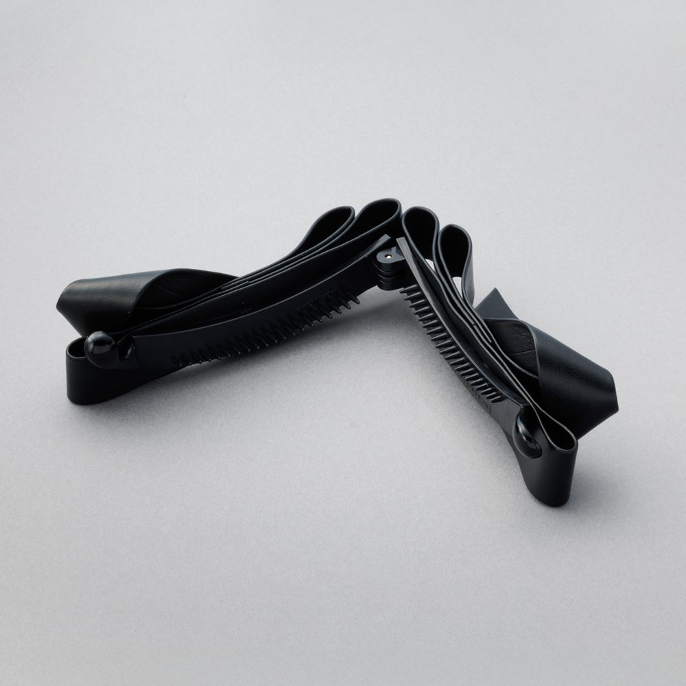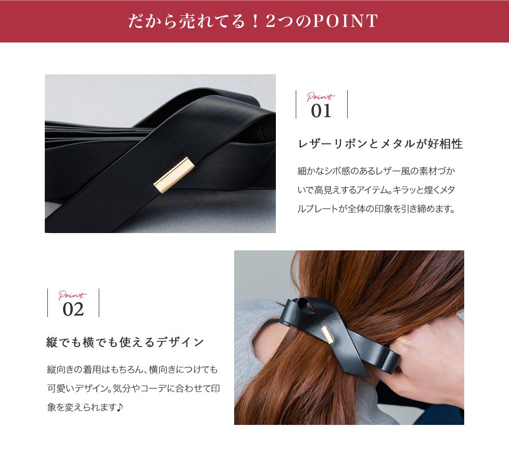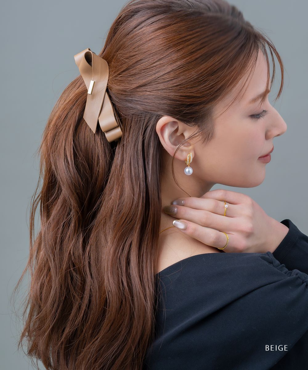 レザー調素材が大人っぽいアシメリボンのバナナクリップ。ニュアンスカラー&折りたたんだような重なりリボンデザインで甘くならずにどんなアレンジにも取り入れやすい◎忙しい朝もこれ一つでこなれ感アップ!
