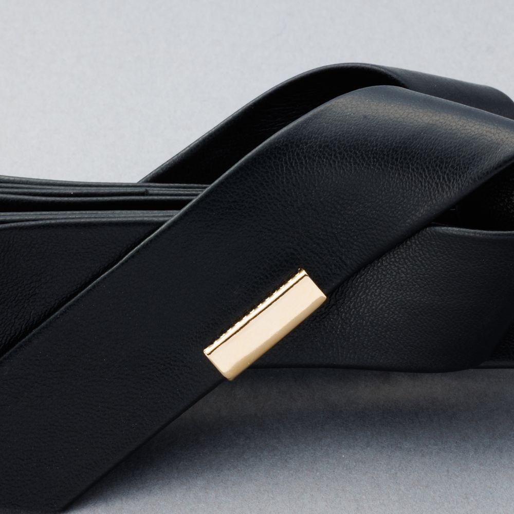 細かなシボ感のあるレザー風の素材づかいで高見えするアイテム。キラッと煌くメタルプレートが全体の印象を引き締めます。