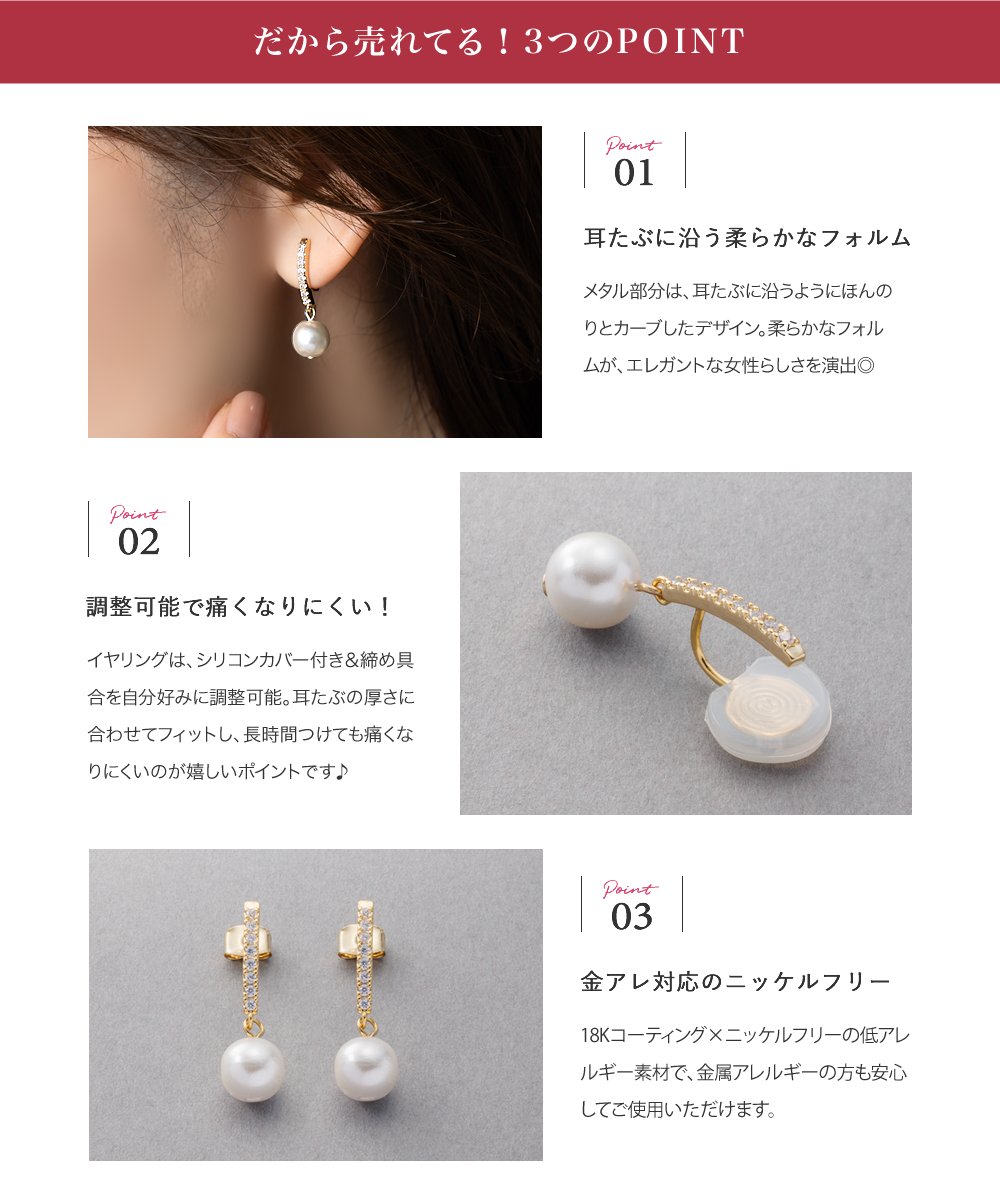 イヤリングは、シリコンカバー付き&締め具合を自分好みに調整可能。耳たぶの厚さに合わせてフィットし、長時間つけても痛くなりにくいのが嬉しいポイントです♪