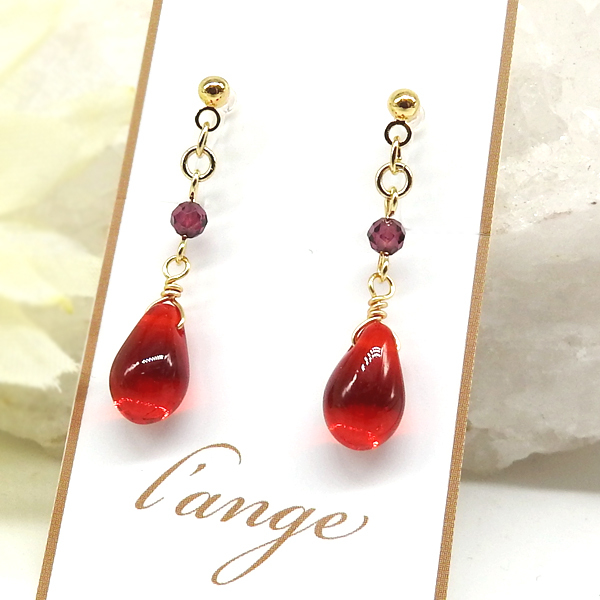 イヤリング ノンホールピアス 樹脂 赤 雫 ガーネット 天然石 揺れる ゴールド レディース レッド