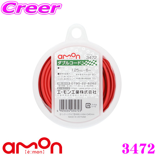 エーモン ダブルコード LINE UP! その他ダブルコードはこちらから!| 3454 | 3455 | 3458 | 3459 | | 0.2sq相当(AWG24)×6m | 0.2sq相当(AWG24)×15m | 0.5sq×6m | 0.5sq×6m | | DC12V車30W以下 DC24V車60W以下 | DC12V車60W以下 DC24V車120W以下 |