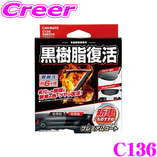 ・カーメイトの黒樹脂復活コートプレミアム、C136です。 ・劣化してしまった樹脂パーツの色とツヤが復活するアイテムです。 ・樹脂に浸透する高濃度タイプなので、ムラにならずに色とツヤが復活!さらに、樹脂と強力に密着するAMS成分を採用。柔軟性のあるコーティング被膜が形成され、コーティング被膜が割れずに復活した色とツヤを長時間持続させます。 ・透明樹脂にも使用することができます。