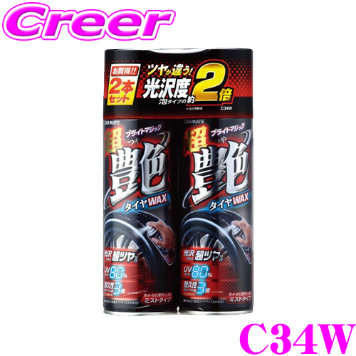 ・カーメイトのブライトマジック 超艶 タイヤWAX 2本セット、C34Wです。 ・光沢のあるピカピカなツヤが得られる超ツヤ仕上げを実現。 ・雨にも強い油性タイプなので、黒いタイヤを長期間持続する驚きの耐久性。 ・霧状に噴霧されるミストタイプなので、スプレー時にホイールに液ダレしません。 ・UV(紫外線)を80%以上カットし、タイヤの色あせ、ひび割れ、劣化を抑えます。 ・本製品で普通タイヤ約48本分お使いいただけます。 ・お試し用にピッタリな1本バラ売りもございます。