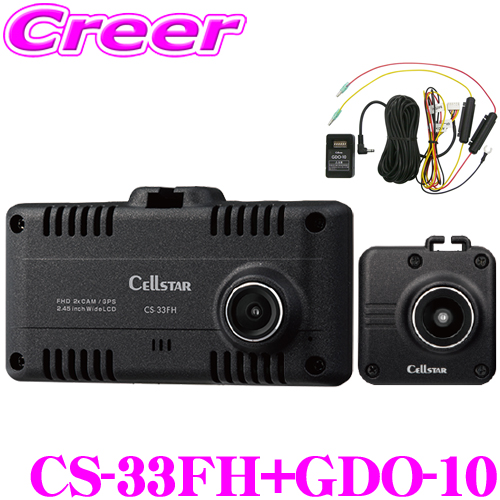 ・セルスターの前後2カメラ 高画質ドライブレコーダー CS-33FHと常時電源コード、GDO-10のセットです。 ・2.45インチワイド液晶タッチパネルを搭載しています。わかりやすいユーザーインターフェースで直感的に操作できます。 ・ワンタッチでパーキングモードをオン/オフ切り替えることができます。電源を入れると現在のパーキングモード設定をボイスアシストでお知らせします。また、パーキングモードの動作時間を本体から設定することが可能です。※パーキングモード機能を使用するには常時電源コード(GDO-10/GDO-24/GDO-41)が必要です。 ・スーパーキャパシタを搭載しているので、事故の衝撃で電源ケーブルが外れてしまっても録画画像を正常に保存するまでは動作するので、 撮り逃しを防ぎます。 ・セルスターのドライブレコーダーは、車内の地上デジタルテレビと電波干渉しにくいよう設計されているから映りが断然キレイです。 ・安心、安全の国内生産、3年保証付きです。