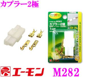 ・エーモン工業のカプラー2極、M282です。 ・2本のコードを同時に接続でき、簡単に脱着可能。 ・端子がカプラー内に収まっているので手に触れることがなく安心。