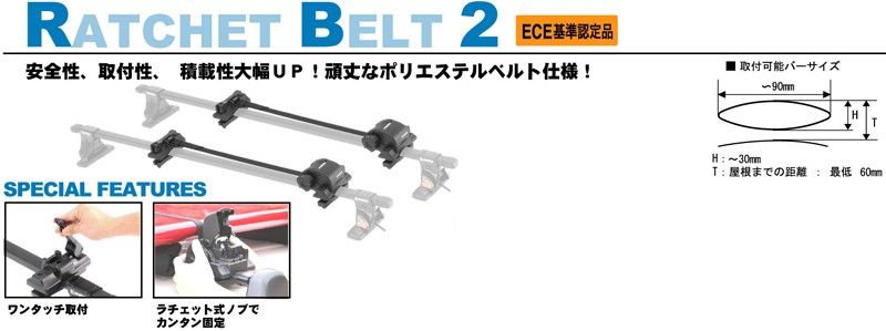 ・安全性、取付性、積載性が大幅にアップした頑丈なポリエステルベルト仕様。巻き取り式ラチェットで快適固定。