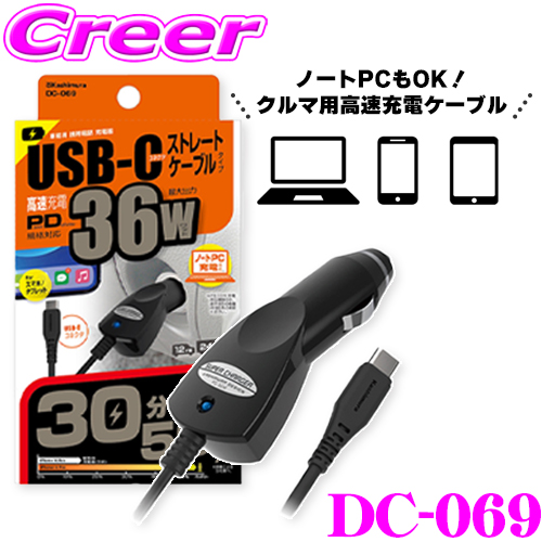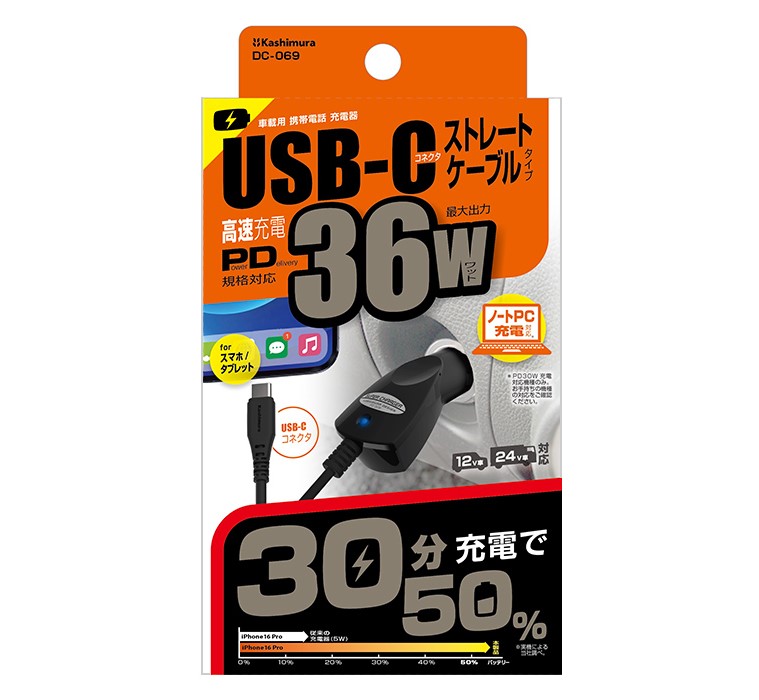 ・カシムラのDC充電器 PD36W Type-C BK、DC-069です。 ・USB PD(Power Delivery)規格対応で、最大36W(12V/3A)と高出力。 ・車のDCソケット電源からスマートフォンのバッテリーを充電する、USB Type-C端子専用のハイパワーDC充電器です。 ・青く光る通電LED付きでストレートコードタイプ。 ・12V車、24V車で使用できます。 |