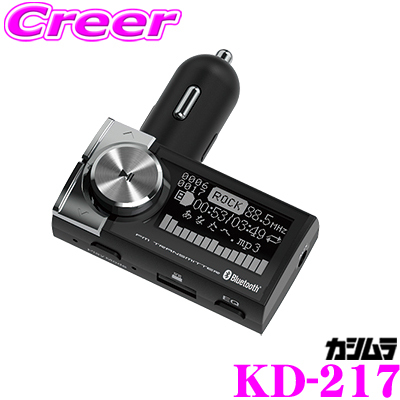 ・カシムラのBluetooth FMトランスミッター EQ AUX MP3プレーヤー付、KD-217です。 ・Bluetooth対応のスマートフォン/iPhoneの音楽やワンセグ音声をワイヤレスで受信し、カーステレオのFMラジオから聴くことができます。また、microSDカード、USBメモリの音楽や音声もカーステレオから聴くことができます。 ・カーステレオへの送信方法を、FM送信もしくはAUX接続から選べます。 ・イコライザー機能付。お好みの音質を6種類から選べます。POP/ROCK/JAZZ/BASS/VOCAL/FLAT ・グライコ液晶表示機能。(Bluetoothで音楽再生時は表示できません。) ・音楽再生中の曲名またはファイル名表示機能。(Bluetoothで音楽再生時は表示できません。) ・141chの周波数から選択できるフルバンドタイプ。周波数76.0MHz〜90.0MHzの範囲から0.1MHz間隔で選択可能です。 ・microSDカード、USBメモリの音楽データを再生できるプレーヤー機能。(最大容量64GB、MP3/WAVファイル対応。) ・リモコン機能付。本製品のボタンで、端末の音楽再生/一時停止/曲送り/曲戻し/通話などの操作ができます。 ・シャッフル再生、曲順通りに再生の2通りの再生モードが選べるPLAY MODEボタン付き。(Bluetoothで音楽再生時は使用できません。) ・USB充電ポート付き。充電しながら音楽やワンセグを聴くことができます。 ・エンジン連動機能。車のエンジンを切ると、本製品とBluetooth接続した端末の再生曲が自動で一時停止します。(一部の機種では自動停止できない場合があります。) ・自動再接続機能。車から離れたりエンジン停止により、本製品と端末のBluetooth接続が切れても、再度車に戻るかエンジンを始動すると端末のBluetooth機能と自動で再接続します。(一部の機種では自動再接続できない場合があります。) ・A2DPプロファイルSCMS-T対応。ワンセグTV音声出力にも対応。 ・角度調節機能。ディスプレイ部分は上下90度の範囲で5段階に可動。操作/確認しやすい角度に調節できます。 ・12V、24V車兼用なので、幅広い車種にご使用頂けます。 ・微弱無線局規定品。 ・ハンズフリー通話対応。(車のカーソケットの位置によっては、通話相手へ音声が聞こえにくい場合があります。)microSDカード、USBメモリで再生中にBluetooth接続(音楽再生・ハンズフリー通話)することはできません。 ※ハイレゾの音楽ファイルには非対応です。 ※車のエンジンを止めてから再開すると、停止時の曲の先頭から再開します。 ※USBコードは付属していません。必ず純正のUSBコードにて充電してください。