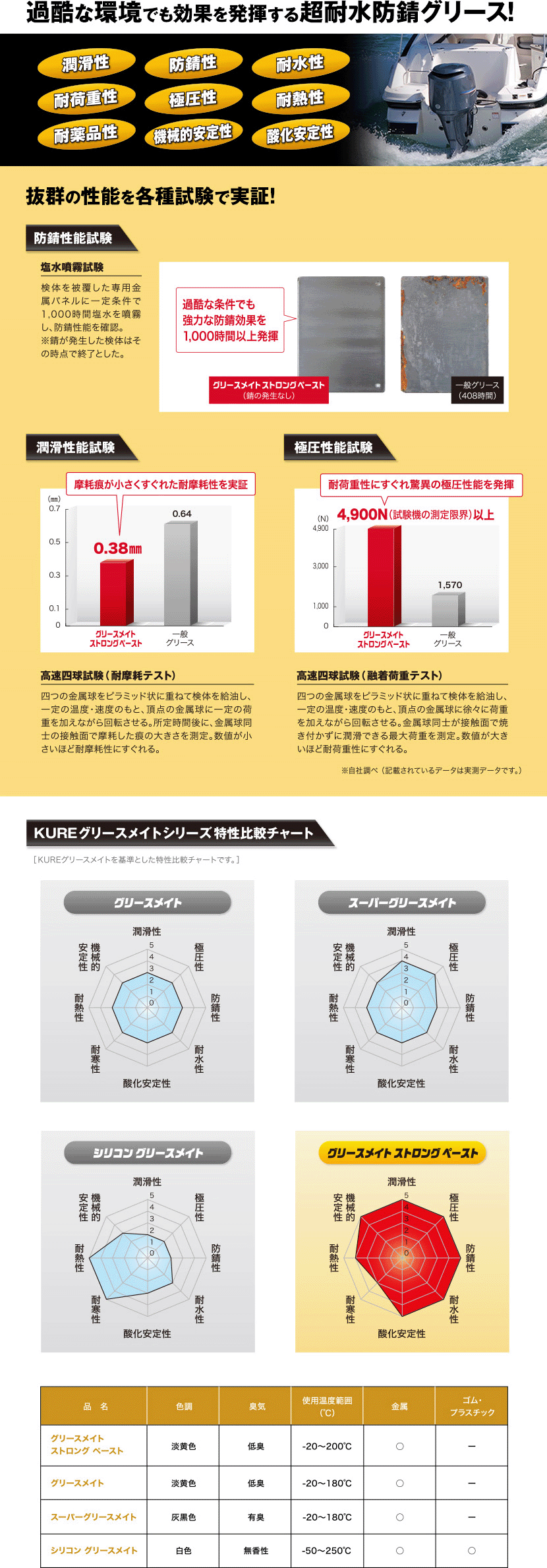 ・耐水性にすぐれ、雨・雪・蒸気・海水などにさらされる箇所でも高い潤滑・防錆効果が長期間持続します。